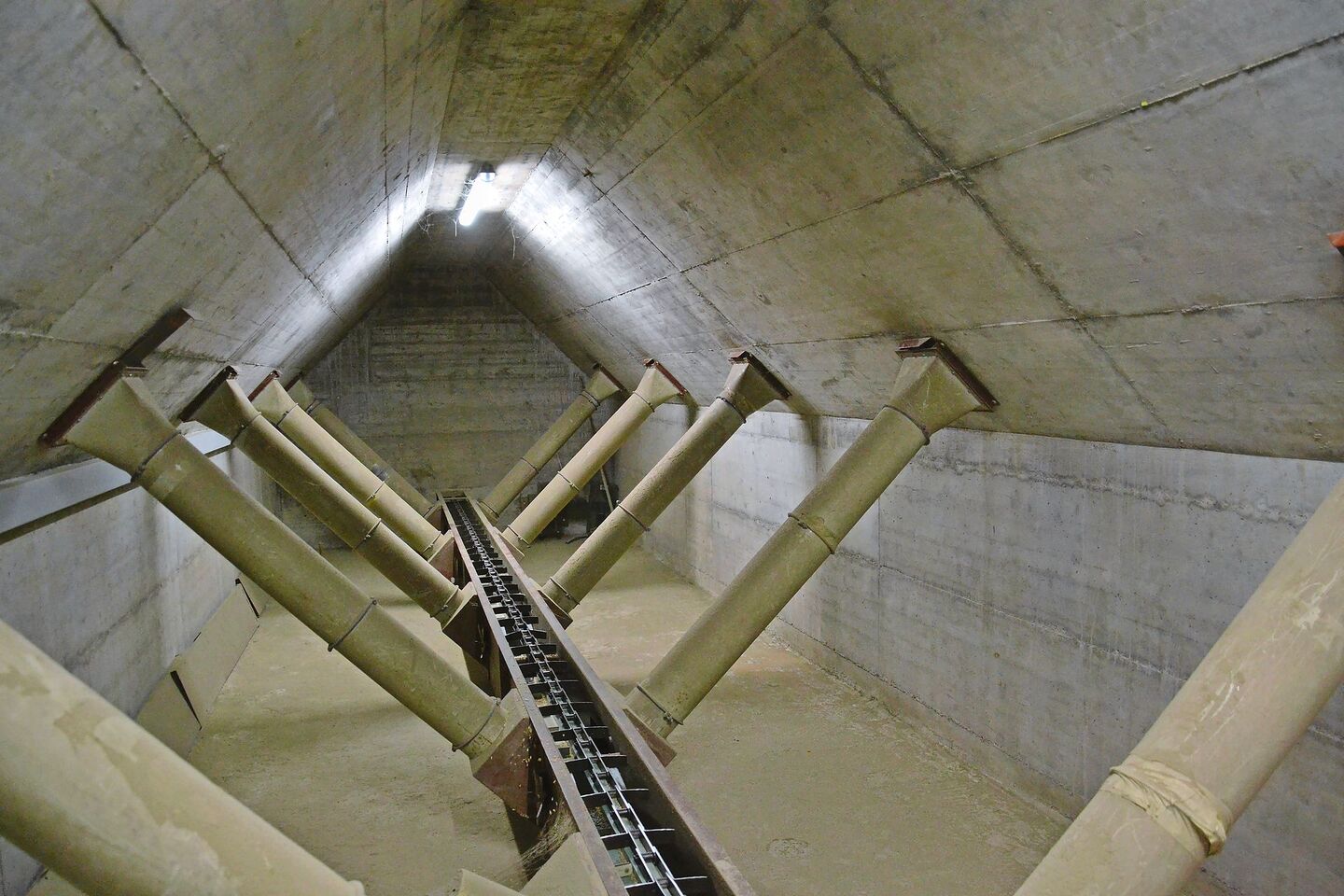 Es ist eng in der eckigen, langgezogenen Kammer, in der Adrian Keller die Schieber zweier Lagerzellen öffnet. Eine dicke Staubschicht bedeckt die zwölf Röhren, die hier auf ein Förderband münden. «Ich habe in diesen zwei Zellen Eiweisserbsen und Ackerbohnen mit unterschiedlichen Qualitäten vorbereitet», erklärt Keller.
