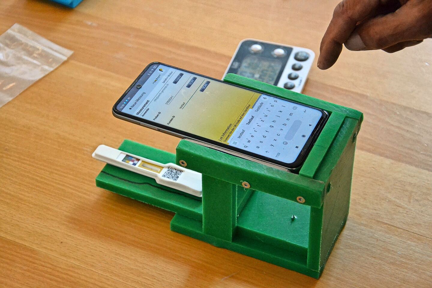 «Bei der anschliessenden digitalen Bildauswertung des Tests mit dem Smartphone sind die Lichtverhältnisse sowie der Kameraabstand entscheidend», bemerkt Hanspeter Lauper. Daher verwendete sein Team eine Eigenkonstruktion, um ein Smartphone im vom Testhersteller angegeben Abstand platzieren zu können.
