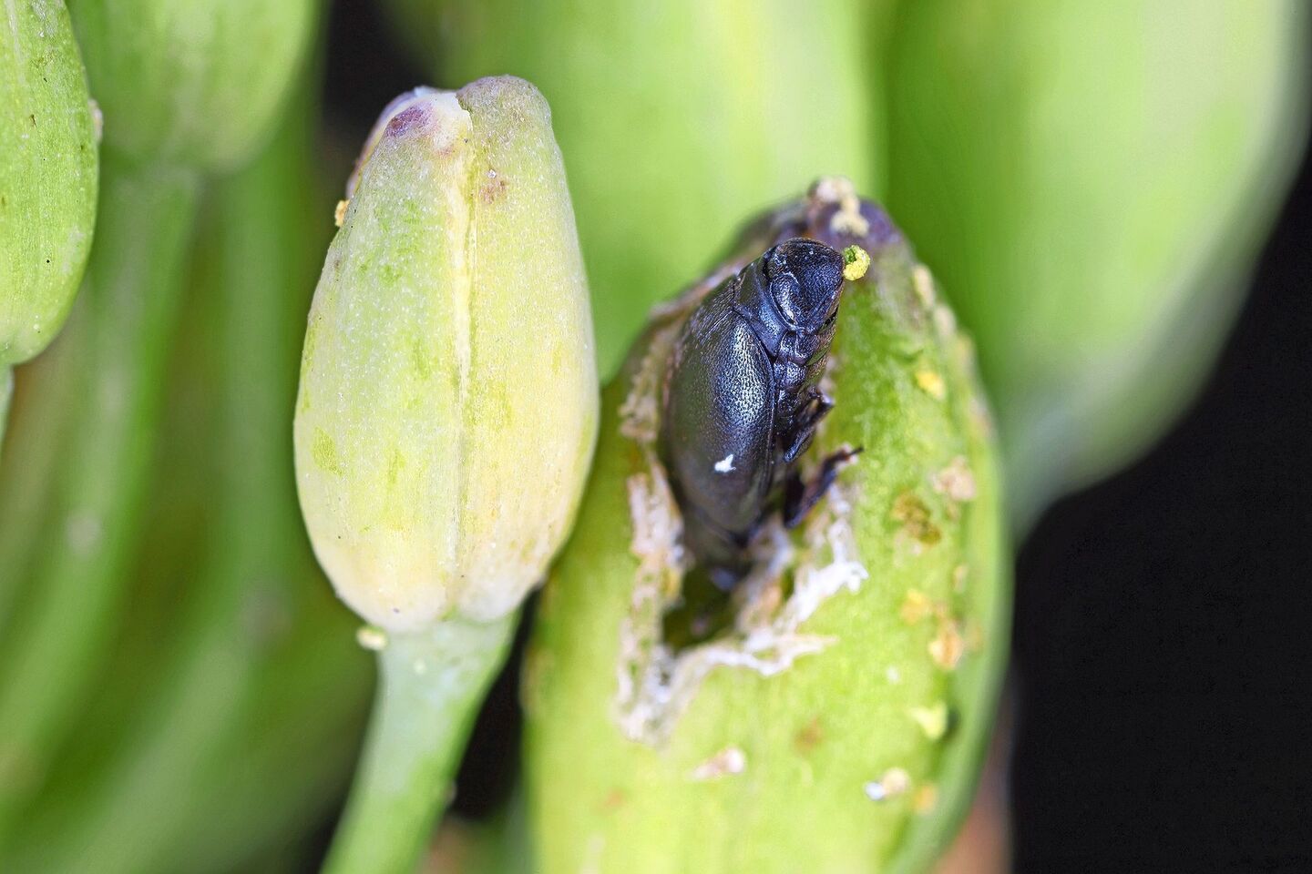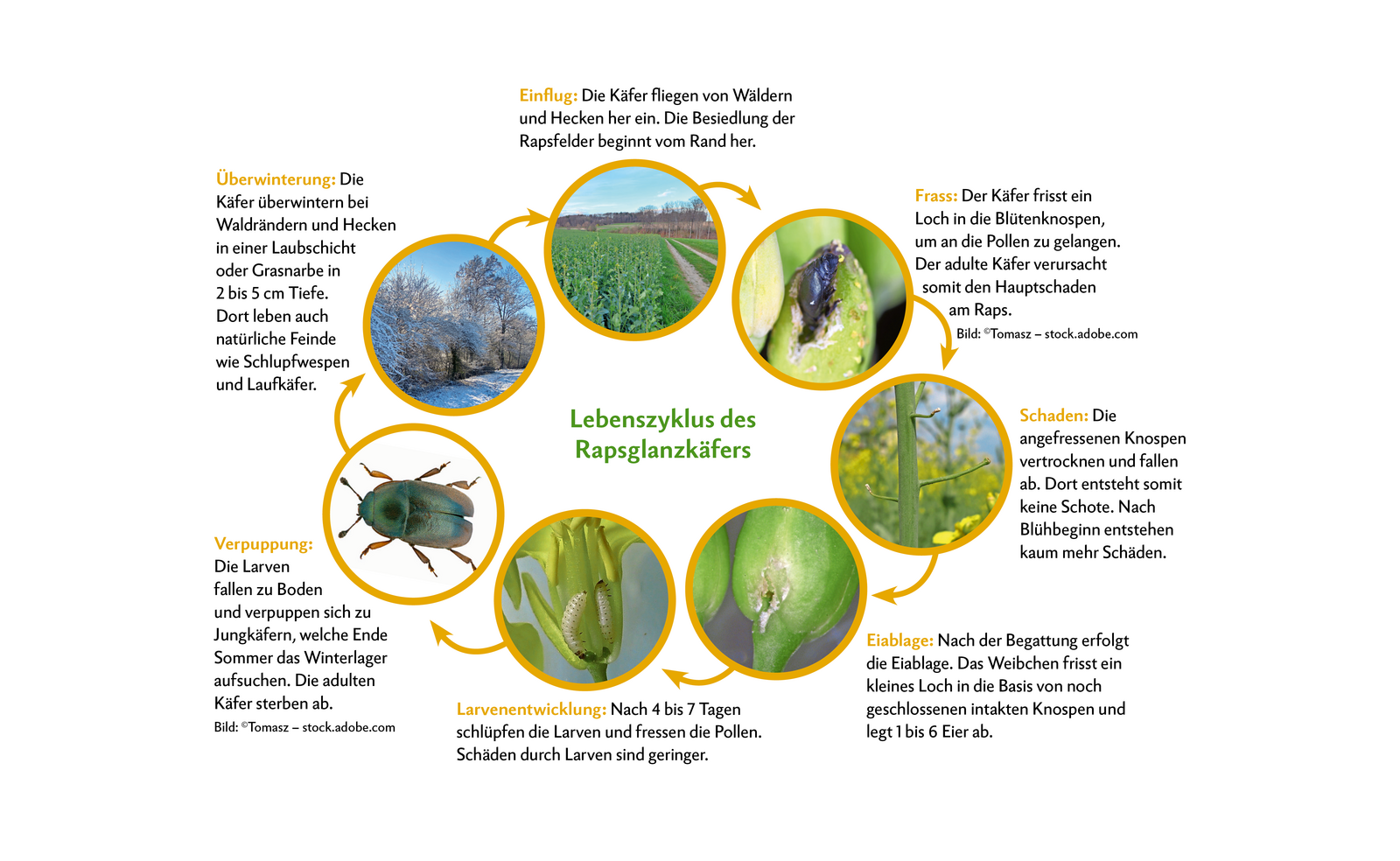 Der Schädlingsdruck ist jedes Jahr unterschiedlich und der Schaden stark wetterabhängig. Bei kaltem Wetter und später Rapsblüte ist der Schaden oft grösser. Dann sind insgesamt weniger Pollen vorhanden und der Käfer frisst deshalb mehr Rapsknospen an. Die Knospen fallen anschliessend ab und der Raps bildet dort keine Schote mehr. Starke Rapspflanzen können den Schaden nur teilweise mittels Seitentriebbildung kompensieren.