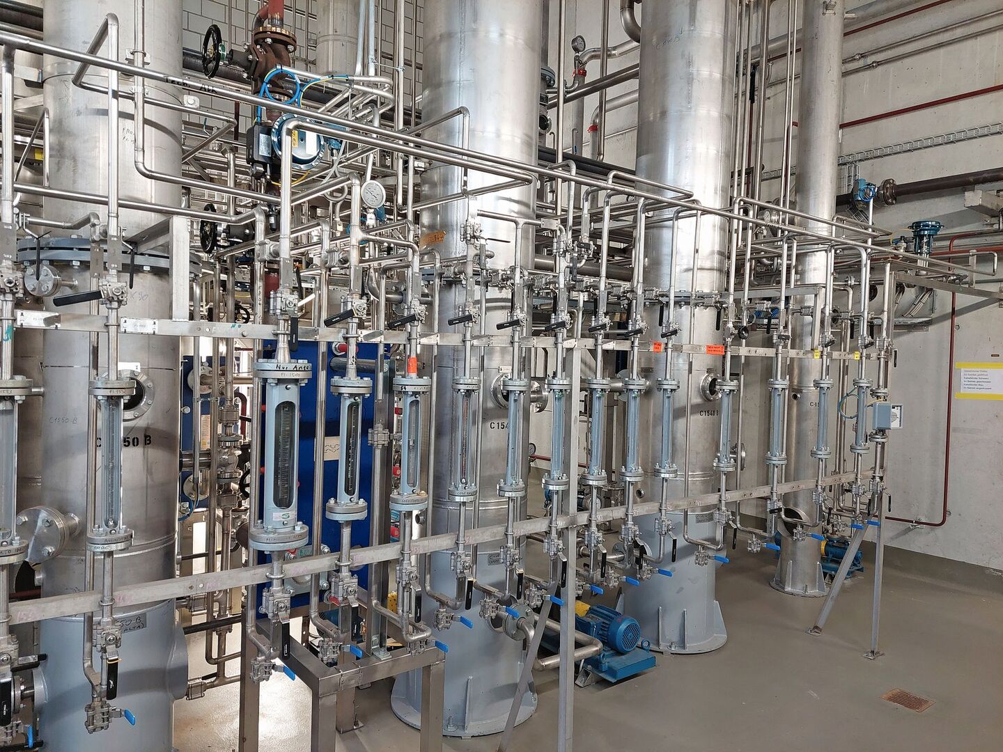 In Aarberg steht eine 5-stufige Anlage. Das heisst, die Maische wird 5 Mal auf verschiedene Temperaturen erhitzt. Bei der Destillation werden die verschiedenen Siedepunkte der einzelnen Stoffe genutzt, um sie vom Ethanol zu trennen. Gewisse Stoffe verflüchtigen sich bei höheren Temperaturen als andere. Mit der Temperatur und der Anzahl Destillationsdurchgänge kann die Qualität des Ethanols beeinflusst werden.