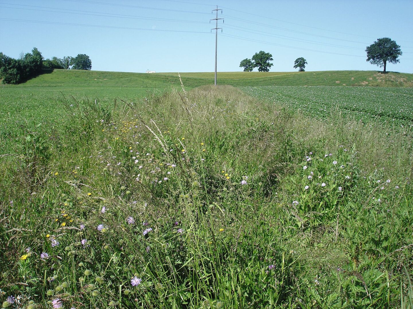 Ein schöner, wertvoller Saum weist einen minimalen Blütenanteil sowie verschiedene Strukturen mit grösseren und kleineren Pflanzen auf. Damit fördert er seltene Insektenarten, Bodenbrüter, Schwebfliegen, Hermeline und Feldhasen.
