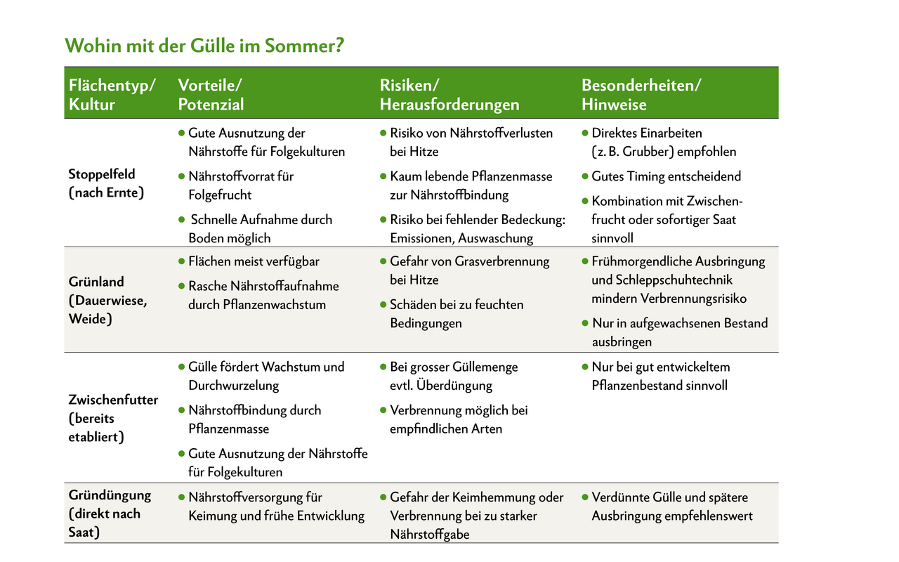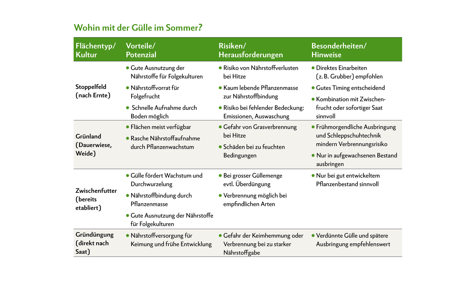 -Gülle im Sommer sollte früh am Tag, mit passender Technik und auf geeigneten Flächen wie Stoppelfeldern ausgebracht werden, um Verluste zu minimieren.