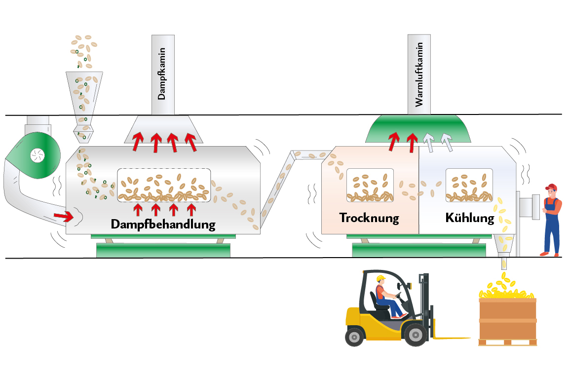 Dann macht der Anlagenführer Dampf, und das im wörtlichen Sinn. Die Anlage kann bis zu 15 Tonnen Saatgut pro Stunde behandeln. Die Kombination von Hitze, Feuchtigkeit und der nötigen Zeitdauer von 60 bis 90 Sekunden unter kontrollierten Bedingungen erlaubt eine Desinfektion des Saatgutes und führt zu Unterdrückung von samenbürtigen Krankheiten.