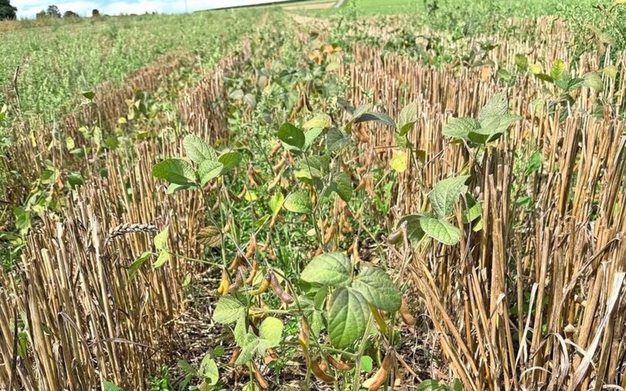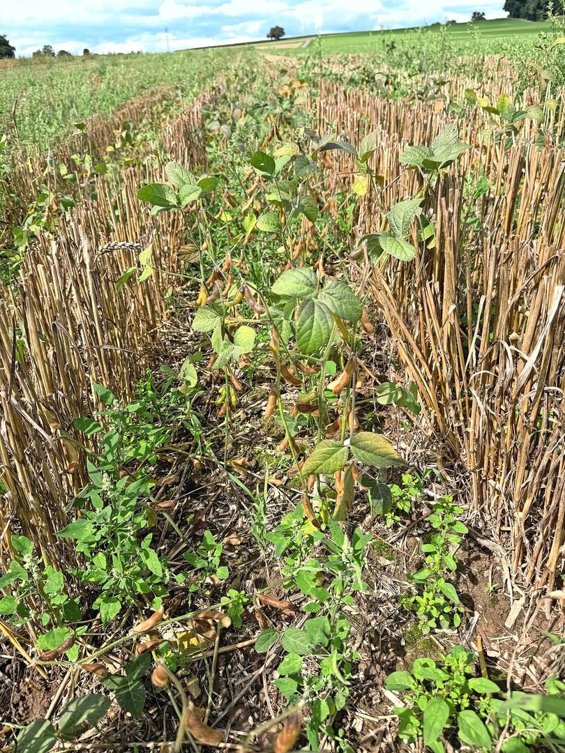Im Staffelkulturanbau wurde der Weizen leider etwas zu tief gedroschen und das Soja dadurch zu stark hinuntergedrückt und teilweise abgeschnitten.