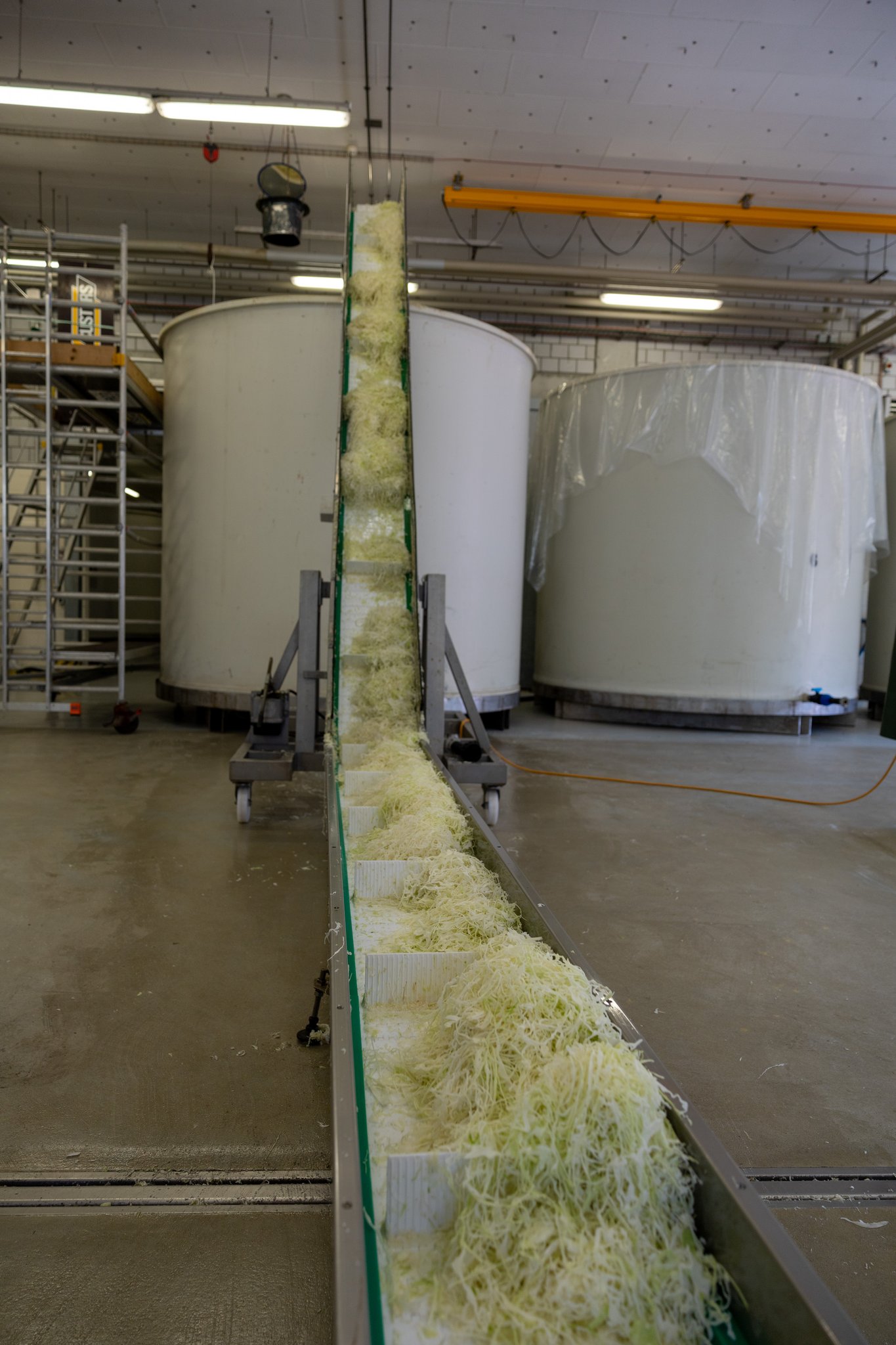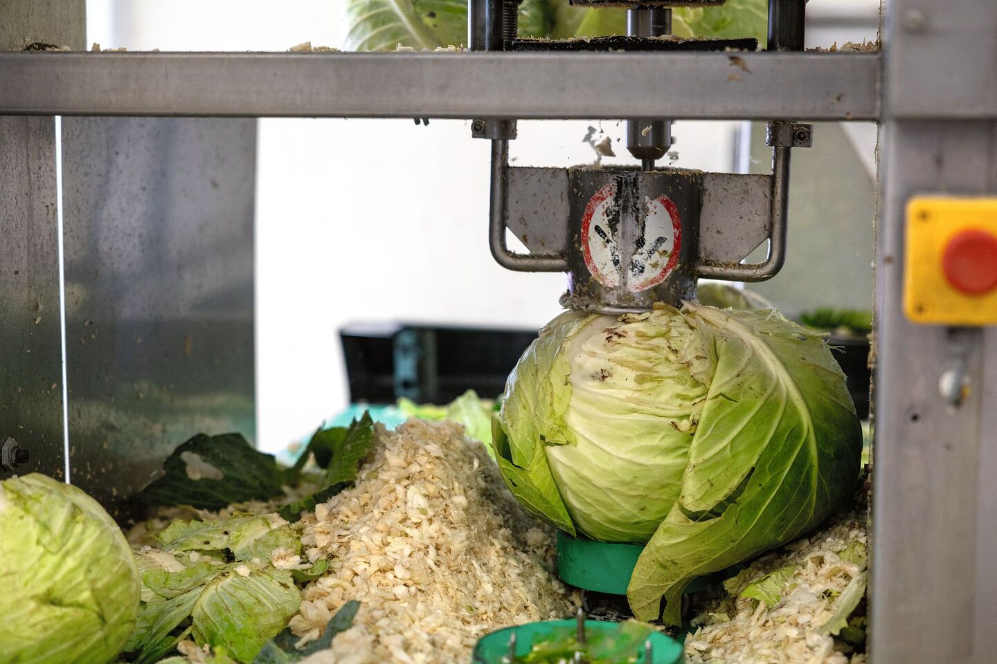 Zuerst wird die Qualität des Kabis überprüft. Wichtig ist, dass er nicht faul ist oder Schädlingsfrass aufweist. Dann wird der Vitamin C- und Zuckergehalt gemessen, welcher für die spätere Fermentation relevant ist. Anschliessend gelangt der Kabis über eine Dosieranlage in die Fabrik zur Rüststrasse mit dem Strunkbohrer. «Obwohl der Strunk am meisten Vitamin C enthält, muss er ausgebohrt werden. Sonst wird das Sauerkraut holzig und ergibt keinen schönen Schnitt», erklärt Geschäftsführerin Andrea Schöni.