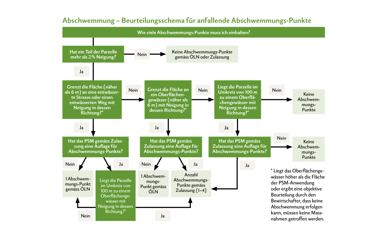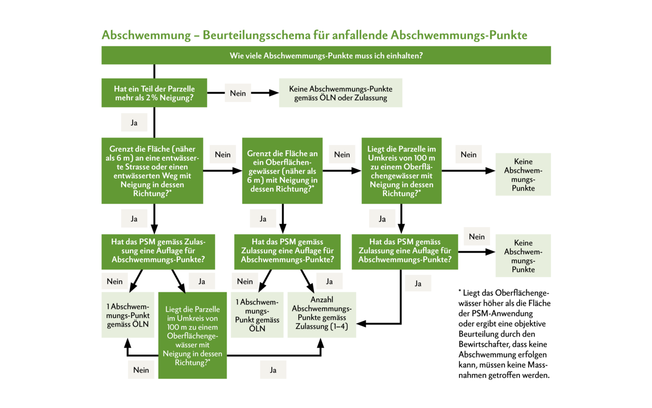 Wie viele Punkte genau eingehalten werden müssen, lässt sich am einfachsten durch den Gebrauch eines Beurteilungsschemas ermitteln. Beim Beantworten der Fragen wird relativ schnell klar, welche Punkte genau einzuhalten sind. Dabei sollten Drift und Abschwemmung jeweils einzeln behandelt werden.