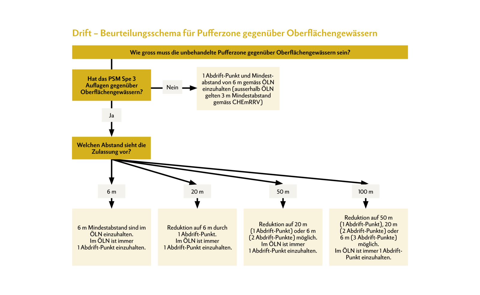 Aufgrund der vorgängig erwähnten Mindestanforderungen der DZV bedeutet dies in der Praxis, dass alle Mittel mit vorgeschriebenen Gewässerabständen von 6 m nicht beachtet werden müssen, da diese sowieso durch den Pufferstreifen aus der DZV schon eingehalten werden. Driftabstände von 20 m sind kein Problem, da diese durch die «Injektordüsenpflicht» ebenfalls auf 6 m reduziert werden. Lediglich bei Mitteln mit vorgeschriebenen Driftabständen von 50 und 100 m sind in Gewässernähe weitere Massnahmen zu ergreifen. Für vereinzelte PSM sind zudem auch Driftabstände hin zu Biotopen und Wohngebieten festgelegt. Wichtig ist hierbei, dass die oben genannten Ausführungen nur für die Reduktion der Abdrift gelten. Mittel können zudem Auflagen zur Abschwemmung enthalten, diese müssen gesondert betrachtet werden.