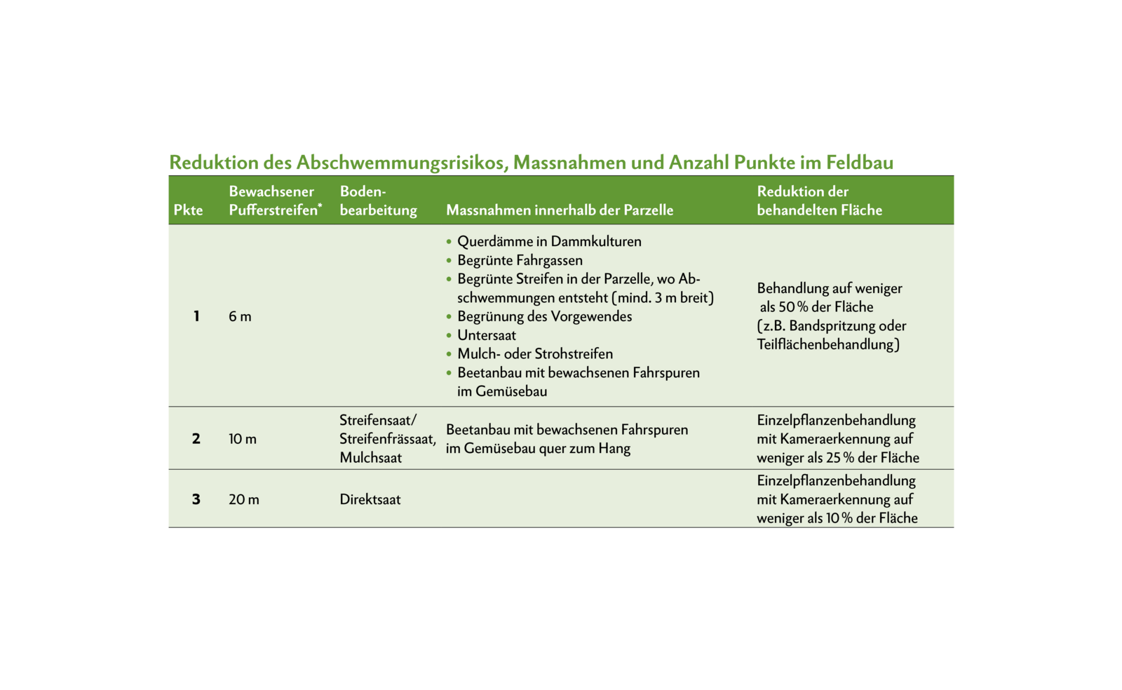 Als «Grundmassnahme», um die Abschwemmung im Feldbau zu reduzieren, gilt der bewachsene Pufferstreifen zwischen Parzelle und Gewässer oder einer angrenzenden Strasse. Es gibt aber auch eine Vielzahl weiterer Möglichkeiten, um die verlangten Abschwemmpunkte zu erreichen, welche zudem auch noch kombiniert werden können. Im Fallbeispiel zur Abschwemmung werden drei konkrete Varianten einer Parzelle vorgestellt.