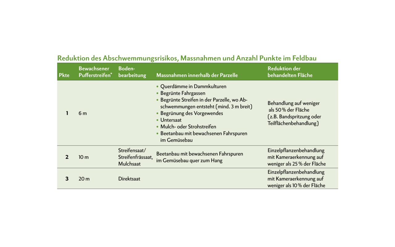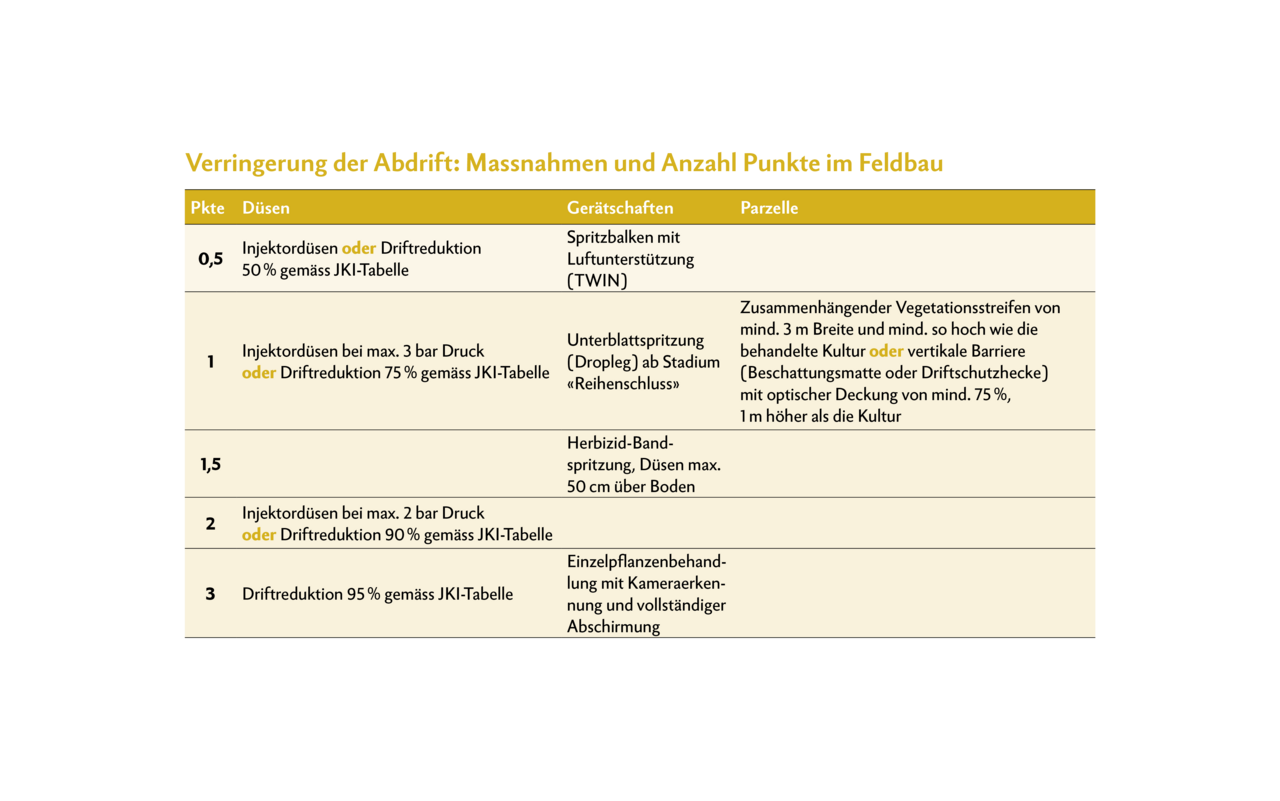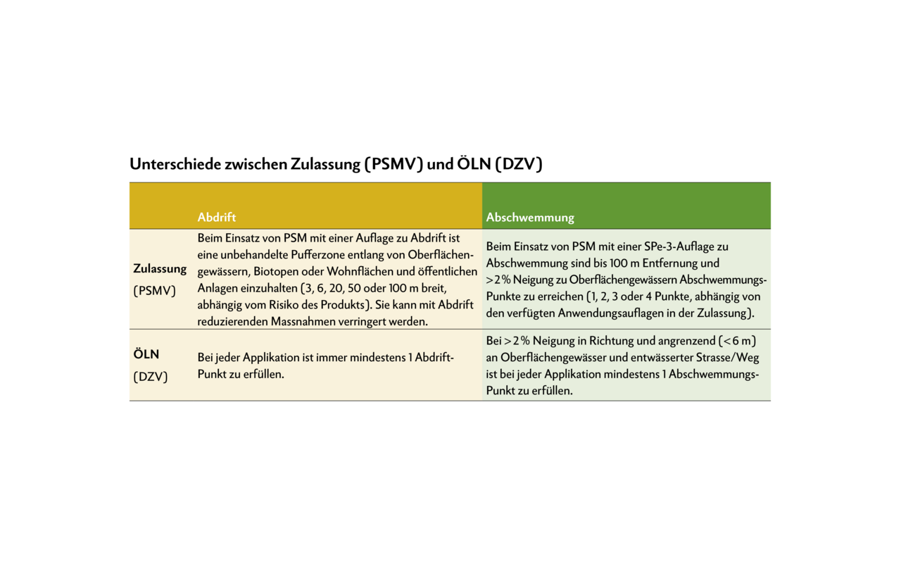 Die Auflagen kommen aus zwei Verordnungen (DZV und PSMV). Die Massnahmen gegen Drift und Abschwemmung werden durch ein Punktesystem geregelt.
