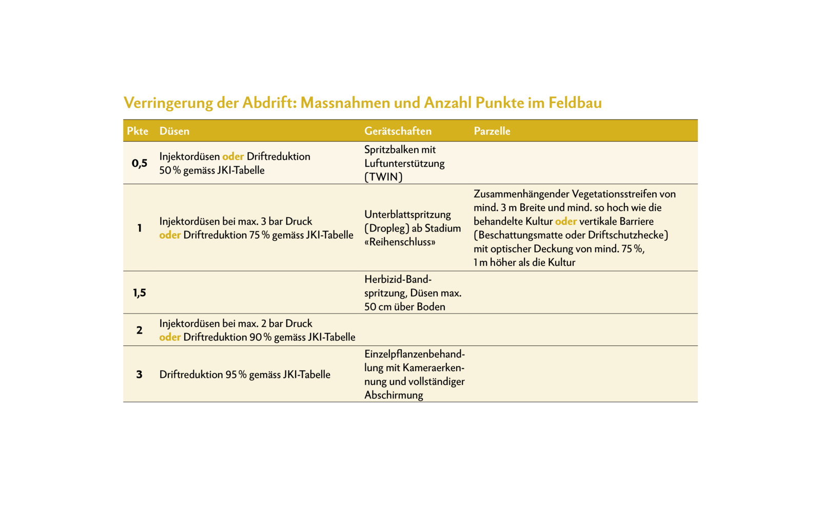 Für mehr Flexibilität sorgt die Tabelle des Julius Kühn Institutes (JKI-Tabelle). In der JKI-Tabelle können Düsen gewählt werden, welche eine Driftreduktion um 75 % aufweisen. Diese reduzieren die Abdrift ebenfalls um eine Stufe beziehungsweise um einen Punkt. Beide Systeme sind parallel anwendbar.