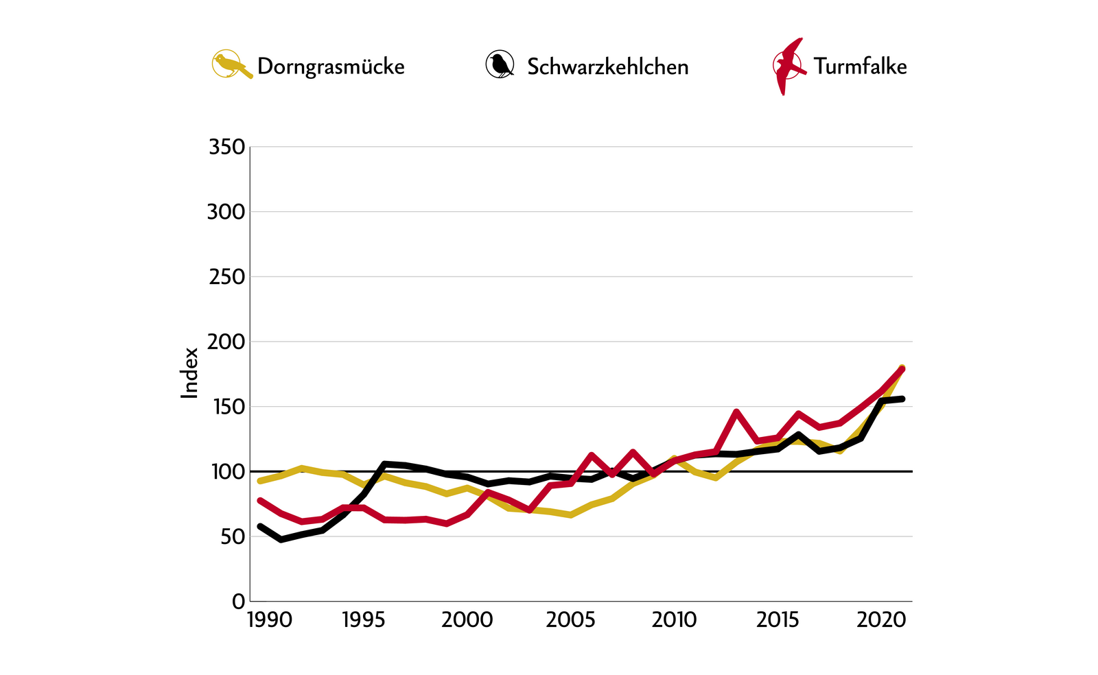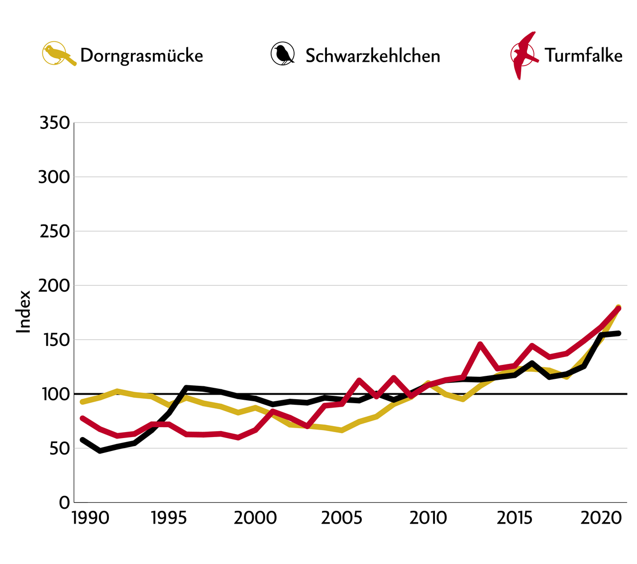 Buntbrachen und artenreiche Säume: Zählungen der Vogelwarte zeigen, dass in Gebieten mit vielen Buntbrachen und artenreichen Säumen die Goldammer, die Dorngrasmücke und das Schwarzkehlchen häufiger vorkommen. Die Dorngrasmücke profitierte zudem von dornenstrauchreichen Hecken mit Krautsäumen als wertvollem Lebensraum. Es sind aber immer noch viele Arten bedroht und ihre Populationsgrösse ist rückläufig.