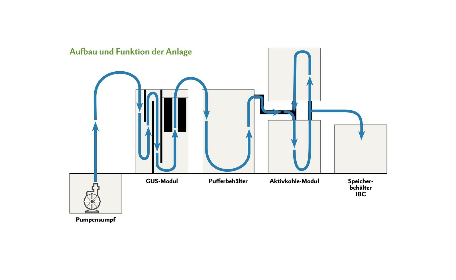 Die Anlage setzt sich aus mehreren aneinandergereihten Modulen zusammen (siehe Abbildung auf der nächsten Seite). Zuerst läuft das Waschwasser vom Waschplatz in einen 2 m3-Sammeltank mit integrierter Pumpe.
