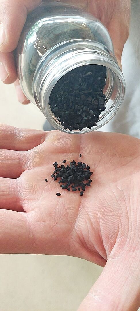 - Das Waschwasser fliesst 20 Mal im Rundlauf durch einen Behälter, der mit Aktivkohle gefüllt ist.