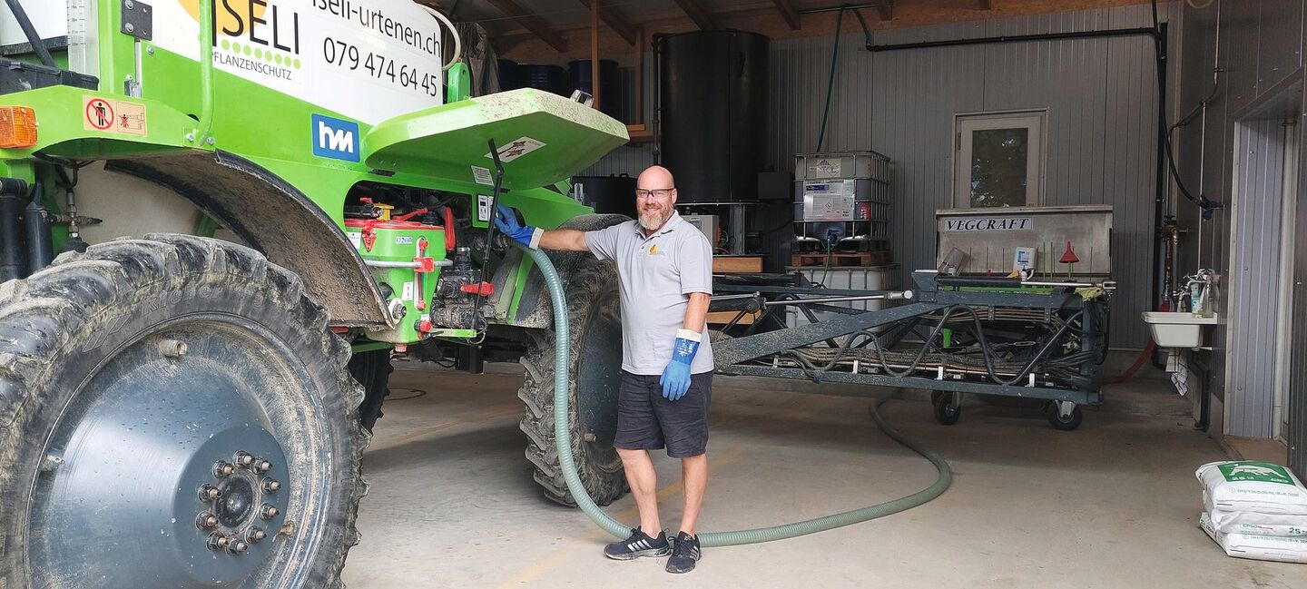 Stefan Iseli aus Urtenen-Schönbühl BE ist Lohnunternehmer und erledigt den Pflanzenschutz für etwa 15 Betriebe. Dabei fällt einiges an Waschwasser an beim zweiten Reinigungsdurchgang der Feldspritze auf dem Waschplatz.