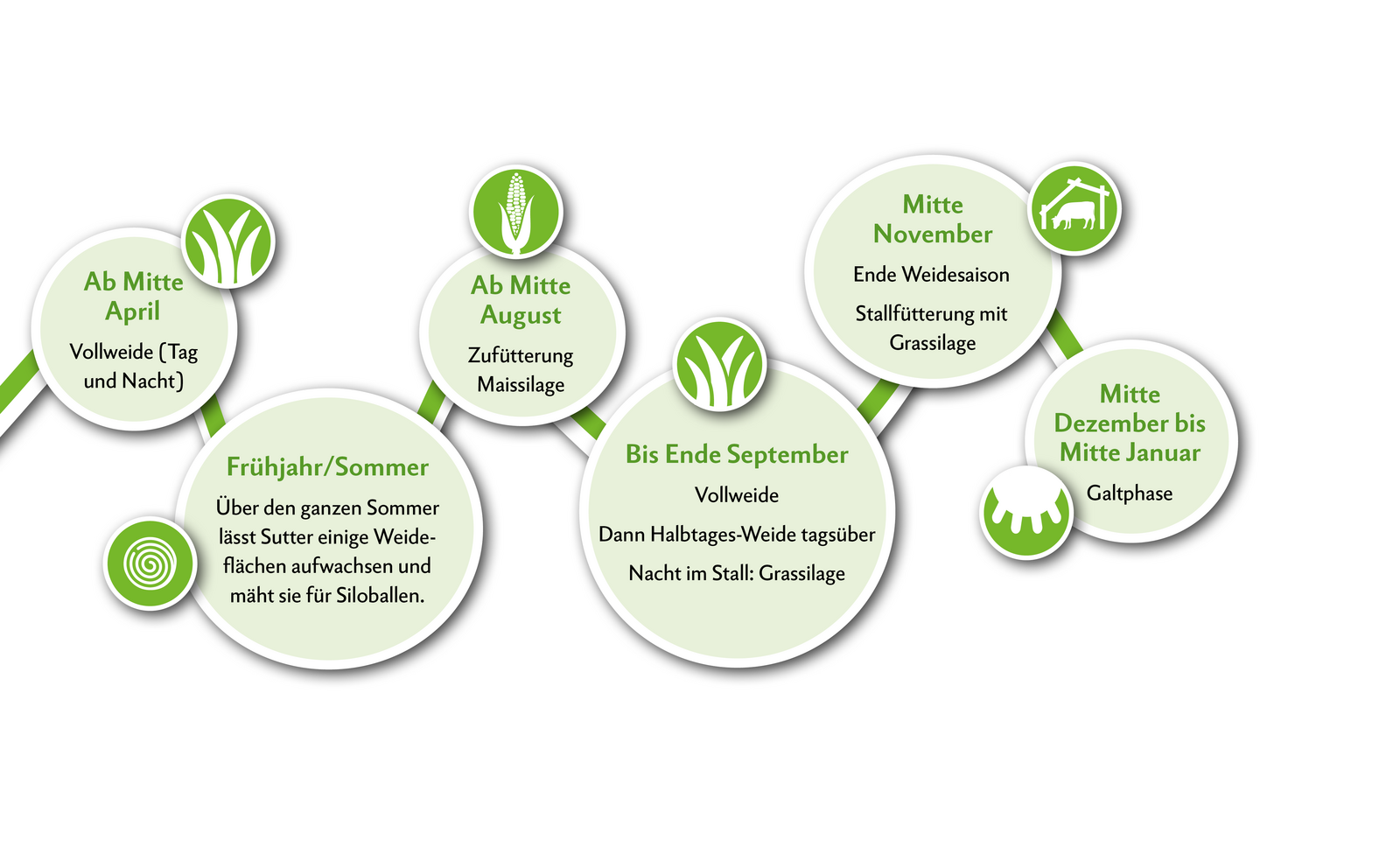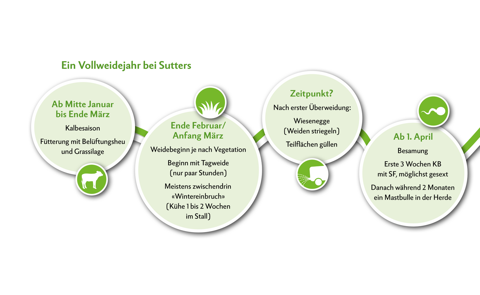 Die Kuh bringt sämtliche Voraussetzungen für die Futterbergung und Futterverwertung mit: Mähwerk, Grashäcksler, Futterlager, Allrad und Gülleausbringung. Ein grosser Teil dieser Arbeitsschritte werden im Vollweidesystem von der Kuh erledigt. Diese Vorteile nutzen Sutters und können so ihre Produktionskosten senken.