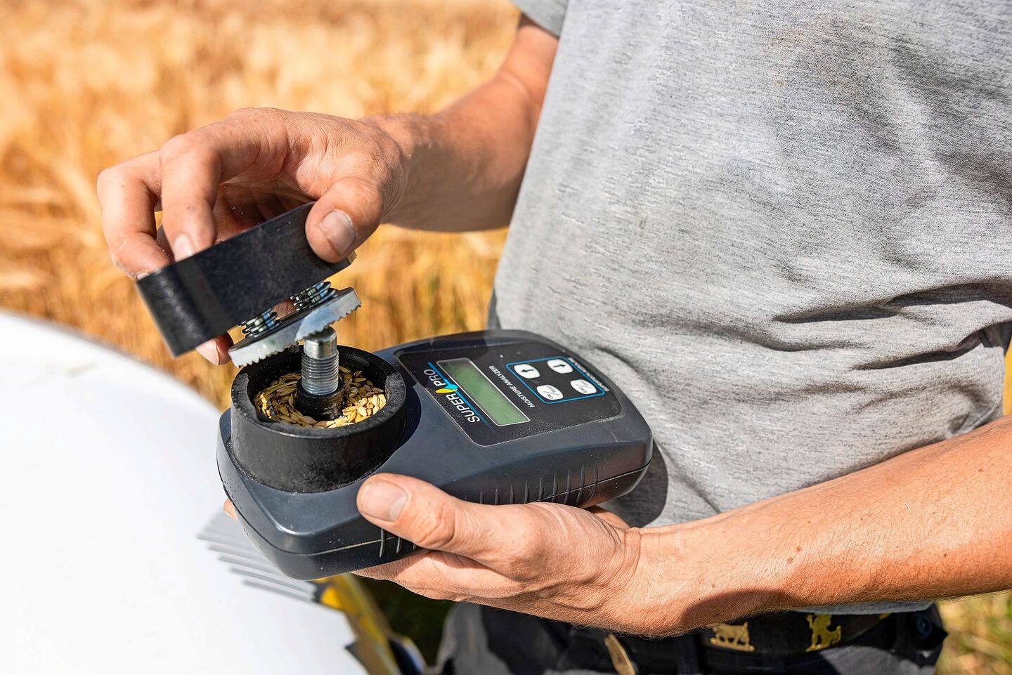 Lukas Christen benutzt ein mobiles Gerät vom Typ «Superpro» von Supertech Agroline mit integriertem Mahlwerk. Dabei wird eine kleine Kornprobe zerkleinert und das Mahlgut analysiert. Das Gerät misst den elektrischen Widerstand – ein Wert, der direkt vom Wassergehalt im Korn abhängt: je feuchter das Korn, desto geringer der Widerstand.Innerhalb weniger Sekunden steht ein präziser Wert zur Verfügung, der unabhängig vom optischen Eindruck die tatsächliche Kornfeuchte widerspiegelt.
