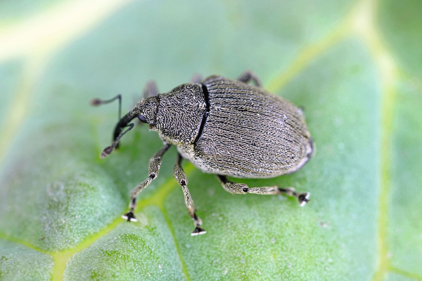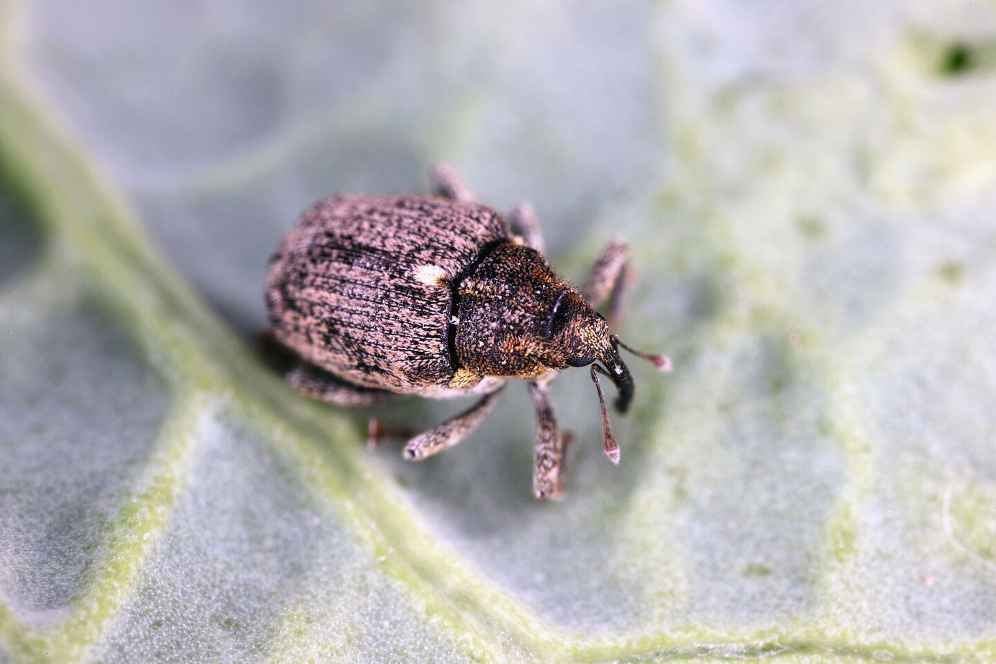 Käfer (Bild 1) ist 3,5–4 mm lang, grauschwarz mit schwarzen Füssen. NICHT verwechseln mit dem gefleckten Kohltriebrüssler (Bild 2) dieser ist kleiner (2,5–3,5 mm lang) und hat einen hellen Fleck auf dem Rücken. Sein Schaden ist deutlich geringer.