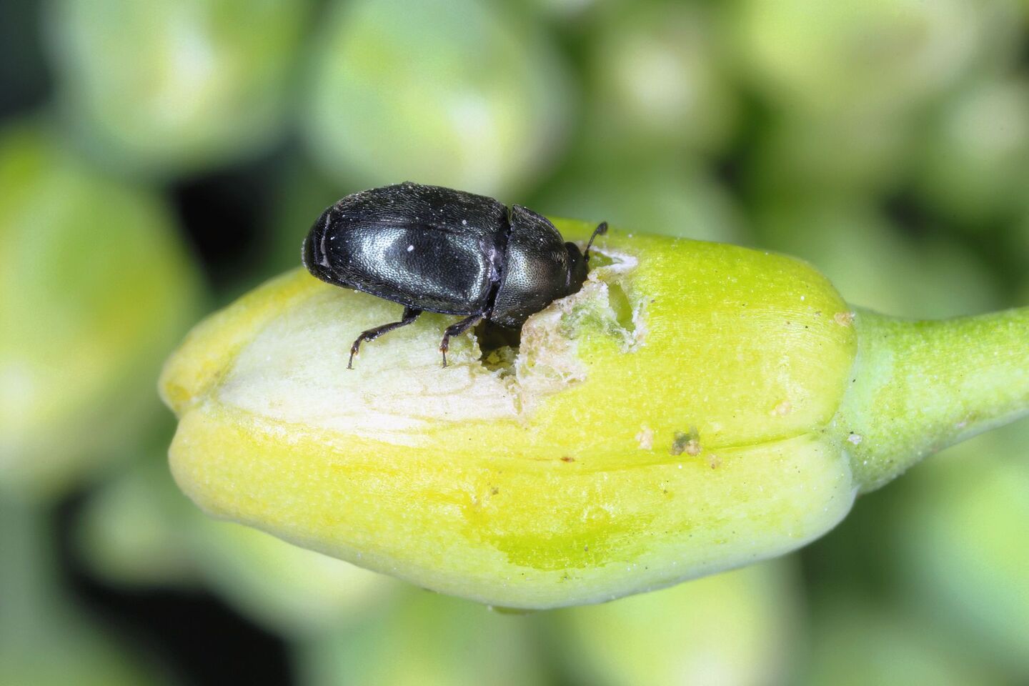 Käfer überwintern an Waldrändern oder Hecken, bis sie Ende März/ Anfang April, sobald die Tagestempera- turen bei 15 °C liegen, in die Rapsfelder einfliegen. Zuerst nur am Rand. Die Käfer fressen ein Loch in die Blüten- knospen, um an die Pollen zu gelangen, wovon sie sich fast ausschliesslich ernähren. Die beschädigten Knospen vertrocknen und fallen anschliessend ab. Ab Blühbeginn entstehen kaum mehr Schäden durch den Käfer. Nach der Begattung legt das Weibchen seine Eier in ein oder mehrere intakte Blütenknospen. Dazu fressen sie ein kleines Loch in die Knospenbasis. Danach sterben die Altkäfer ab. Die Larven schlüpfen 3 bis 4 Wochen später und ernähren sich vom Pollen. Anschliessend fallen sie zu Boden, wo sie sich zu Jungkäfer verpuppen. Diese bewegen sich im August ins Winterlager.