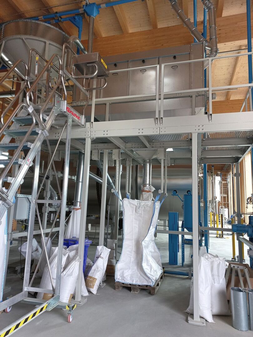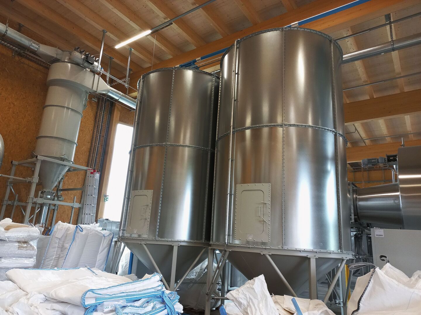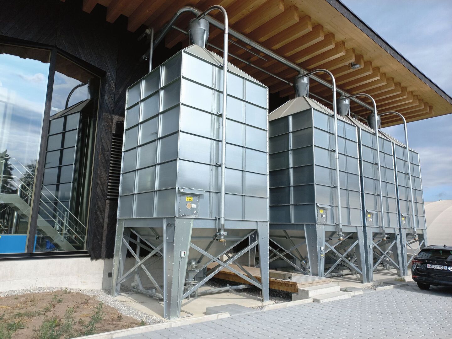 Durch den Aspirator (links) wird das Malz entstaubt und schliesslich in den Puffersilos (rechts) zwischengelagert. Vor dem Absacken durchläuft es den Reinigungsvorgang ein zweites Mal.