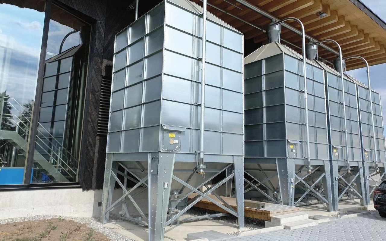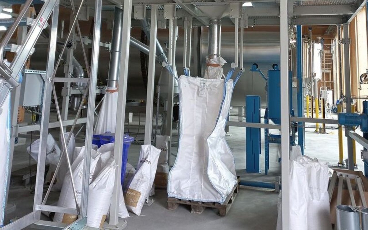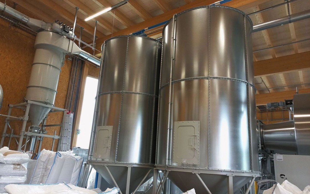 Durch den Aspirator (links) wird das Malz entstaubt und schliesslich in den Puffersilos (rechts) zwischengelagert. Vor dem Absacken durchläuft es den Reinigungsvorgang ein zweites Mal.