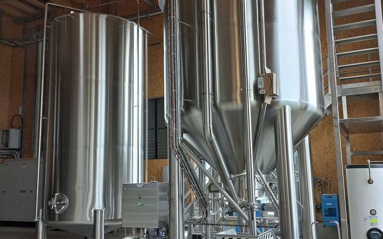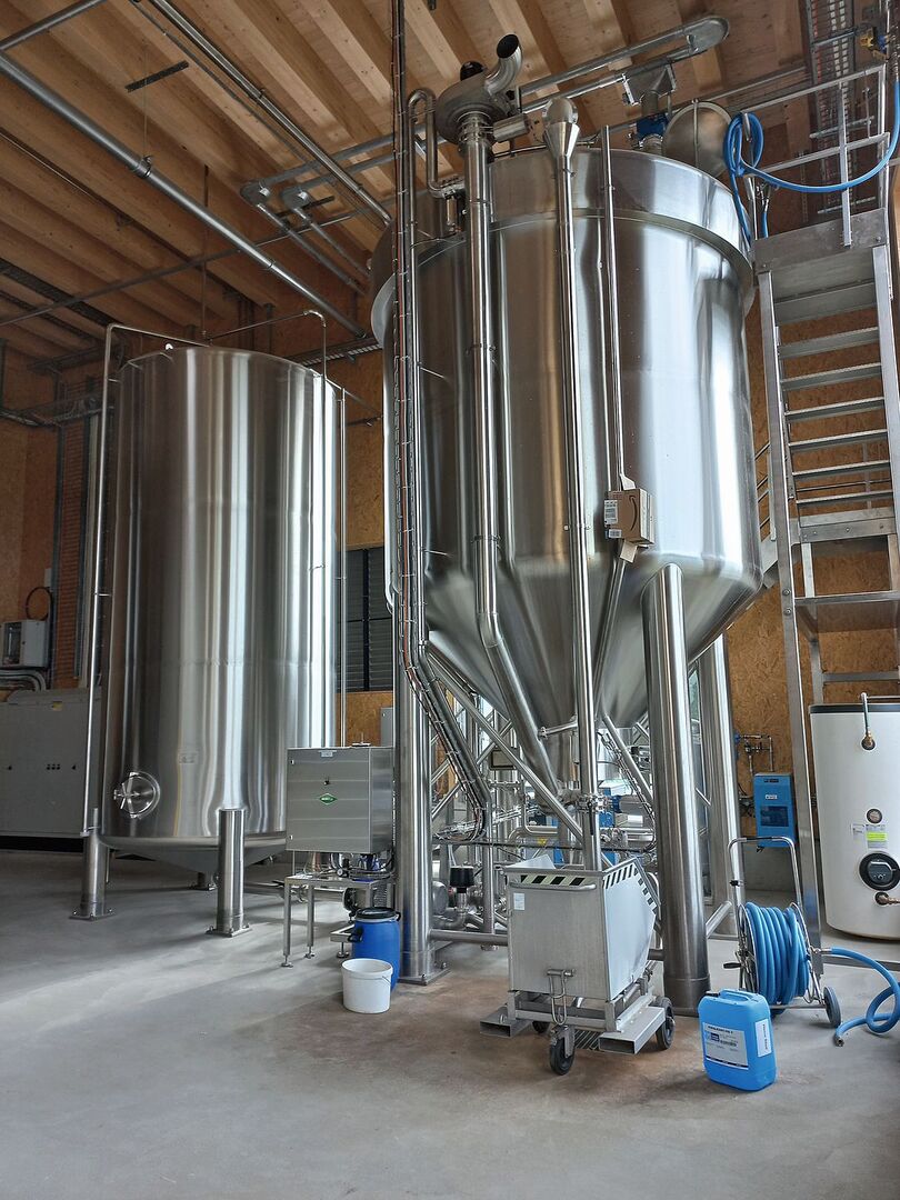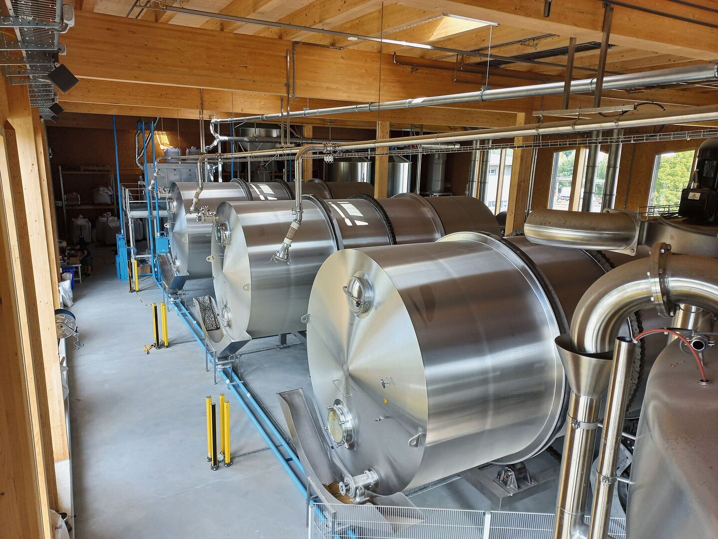 Vom Lager werden jeweils zehn Tonnen Gerste in den «Weichetank» rechts gepumpt. Mit Wasser aus dem linken Tank wird die Gerste während 24 Stunden unter Rühren eingeweicht.