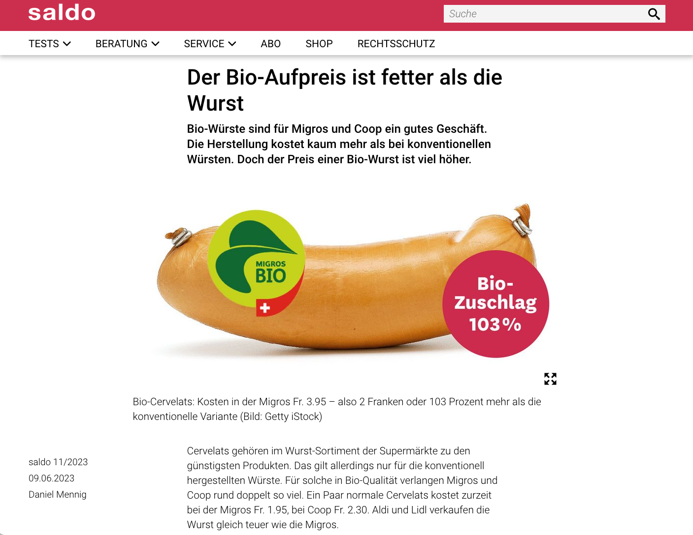 So schreibt zum Beispiel auch die Konsumenten-Zeitschrift «Saldo» unter dem Titel «Der Bio-Aufpreis ist fetter als die Wurst», dass Migros und Coop ein Paar Bio Suisse-Cervelats für 3.95 Franken verkaufen. Das ist mehr als doppelt so soviel wie der Preis für konventionelle Cervelats – obwohl die Produktion nur 8 Rappen pro 100 Gramm teurer ist.