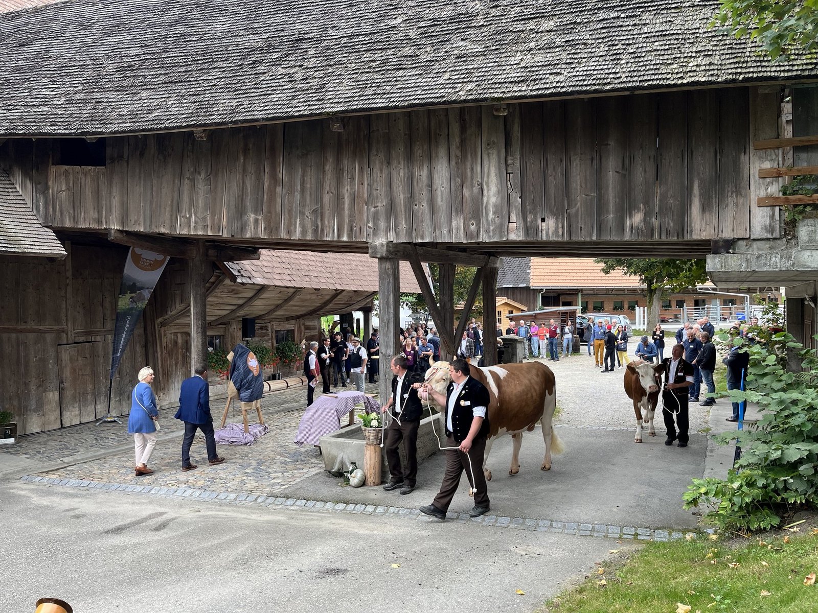 Ein Käse, der etwas auf sich hält, braucht einen Markenbotschafter. Der «Simmentaler Original» hat gleich deren zwei: Kelly ist eine noch junge Simmentalerkuh. Neben ihr steht der Stier Santos, der bereits an der BEA 2022 einen grossen Auftritt hatte. Zusammen enthüllten Kelly und Santos den neuen Käse.