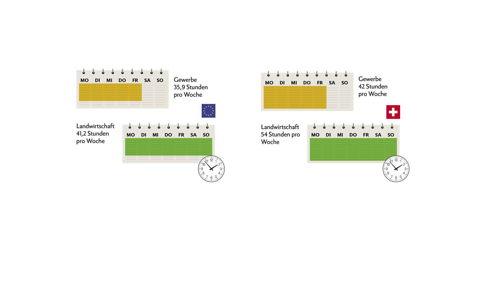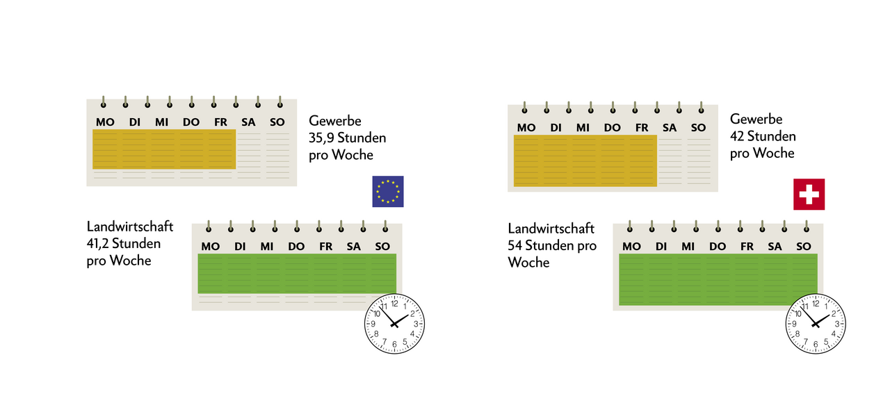 Sowohl in der Schweiz wie in der EU sind die durchschnittlichen Arbeitszeiten im Schnitt höher als bei den meisten Gewerbetreibenden. Zu bedenken gilt es allerdings, dass Angestellte im Gegensatz zu LandwirtInnen häufig einen (unbezahlten) Arbeitsweg haben, der in keiner Statistik erscheint.