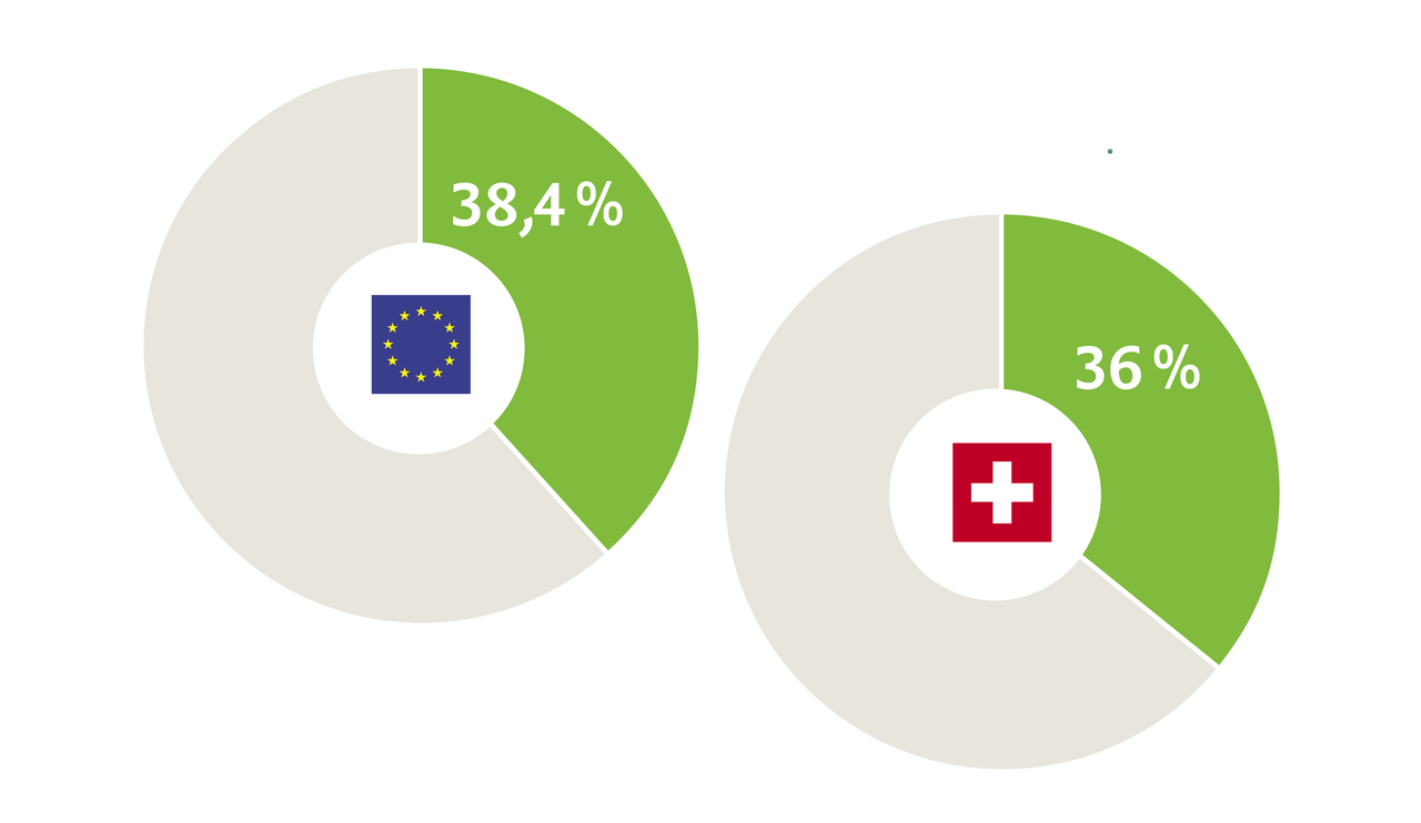Die Grafiken der folgenden drei Seiten stützen sich, wenn es um die EU geht, auf die Schlüsselzahlen-Broschüre von Eurostat. Als Grundlage für die Schweizer Zahlen dienen die Erhebungen des Bundesamts für Statistik BfS.