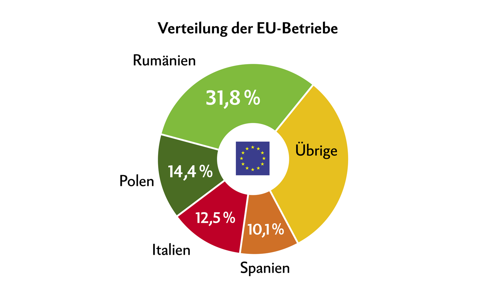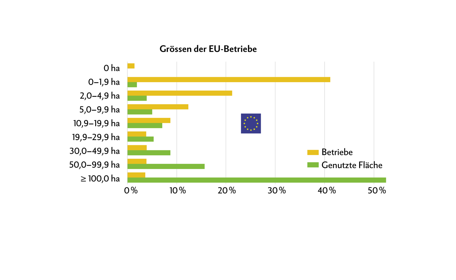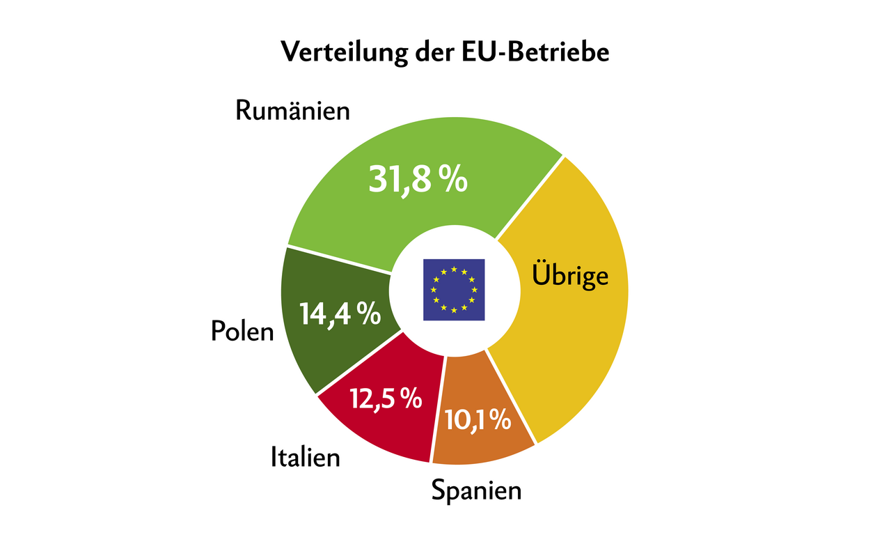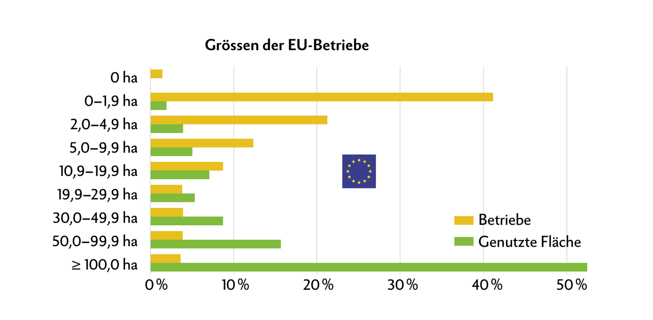 Die durchschnittliche Grösse eines landwirtschaftlichen Betriebs in der EU lag im Jahr 2020 bei 17,4 ha. Allerdings waren 64 % der landwirtschaftlichen Betriebe in der EU weniger als 5 ha gross, während etwas 11 % eine Fläche von 30 ha oder mehr haben.