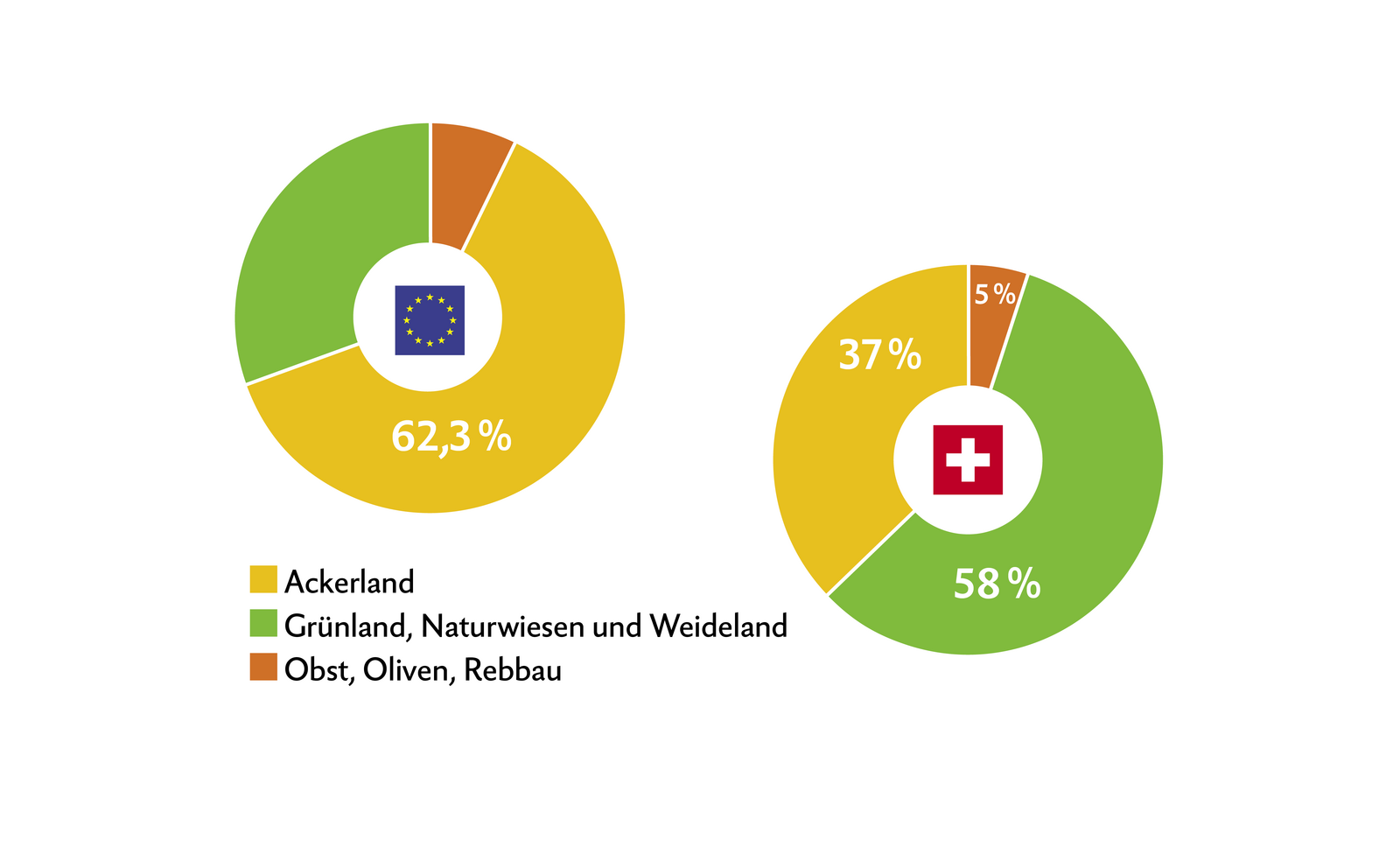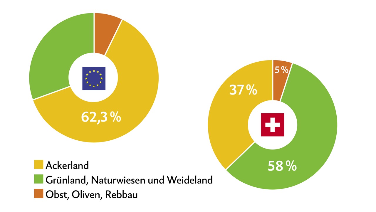 In der Schweiz macht die landwirtschaftlich genutzte Fläche (inkl. Sömmerungsflächen) mit 1, 4 Mio ha 36 % der ganzen Landesfläche aus(4,13 Mio ha).