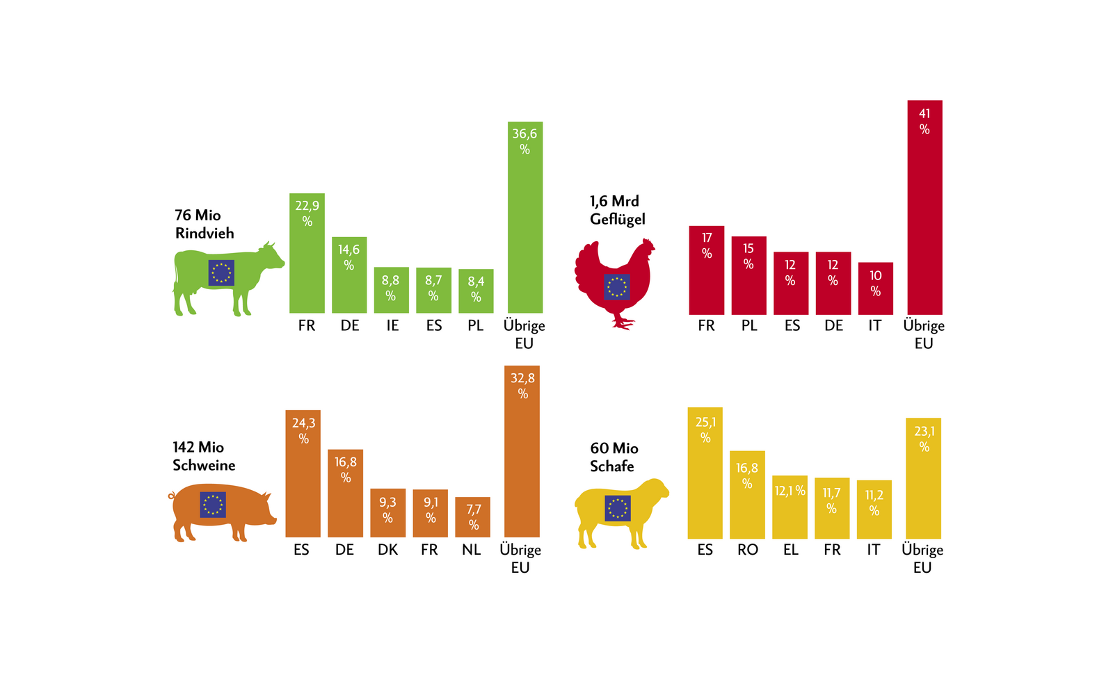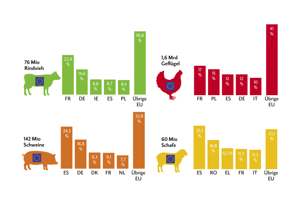 Die EU hat einen beträchtlichen Viehbestand: Ende 2021 gab es 142 Mio Schweine, 76 Mio Rinder und schätzungsweise71 Mio Schafe und Ziegen in EU-Betrieben. Zahlen zum Geflügel lagen für 2021 noch keine vor. 2020 gab es aber1,6 Mrd Hühner in der EU.