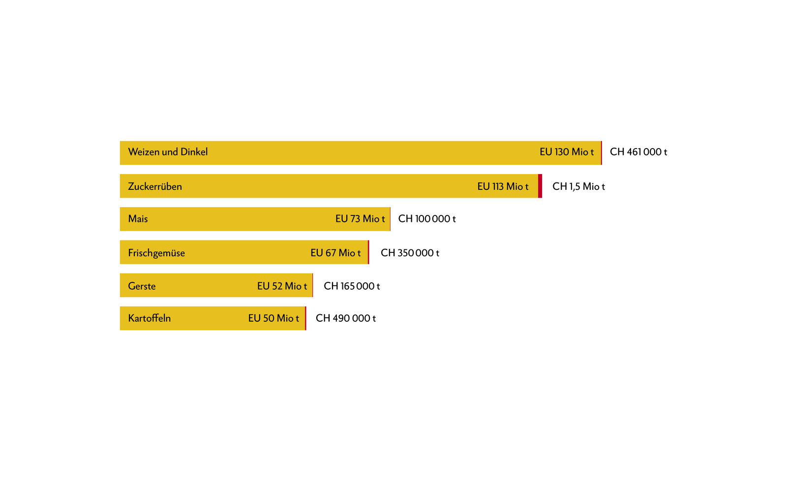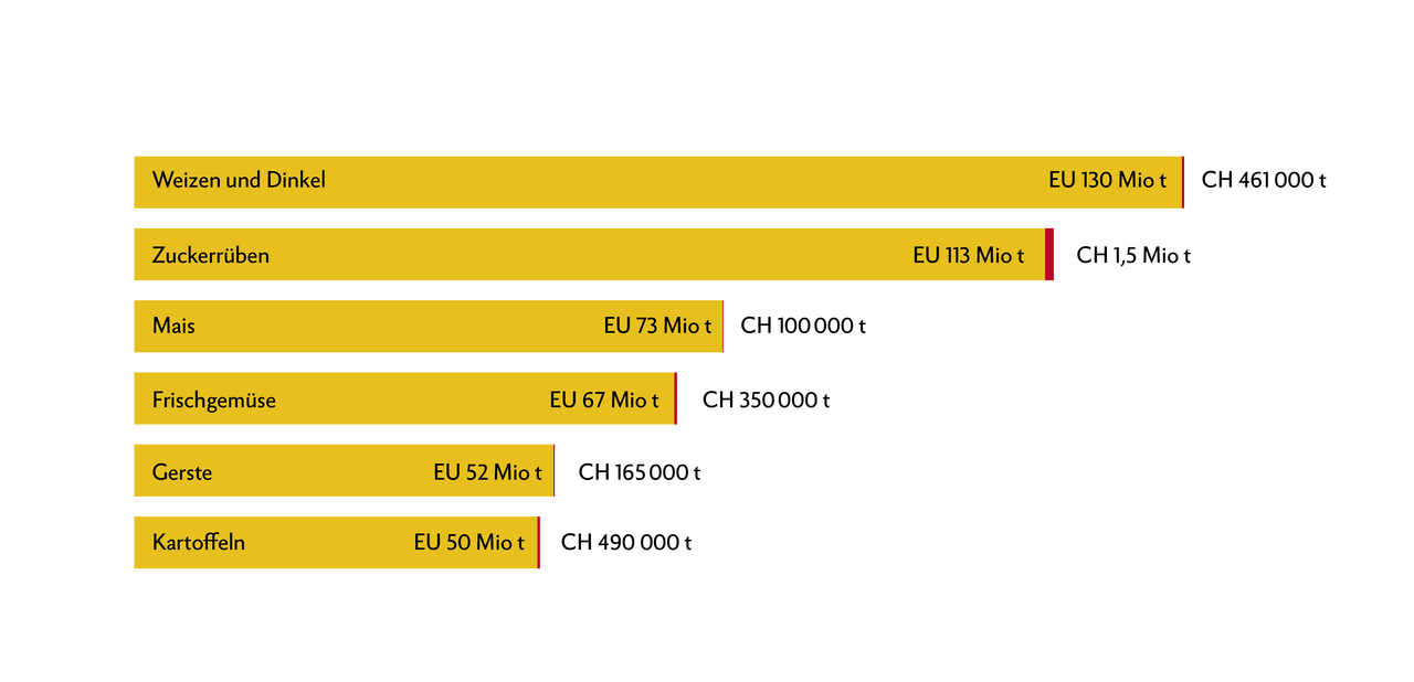 In der Schweiz erntete die Landwirtschaft gemäss der EU-Statistik vor allem Weizen und Dinkel (46' 000 t), Zuckerrüben (1,5 Mio t), Mais (100'000 t), Frischgemüse (350'000 t), Gerste (165'000 t) und Kartoffeln (490'000 t).