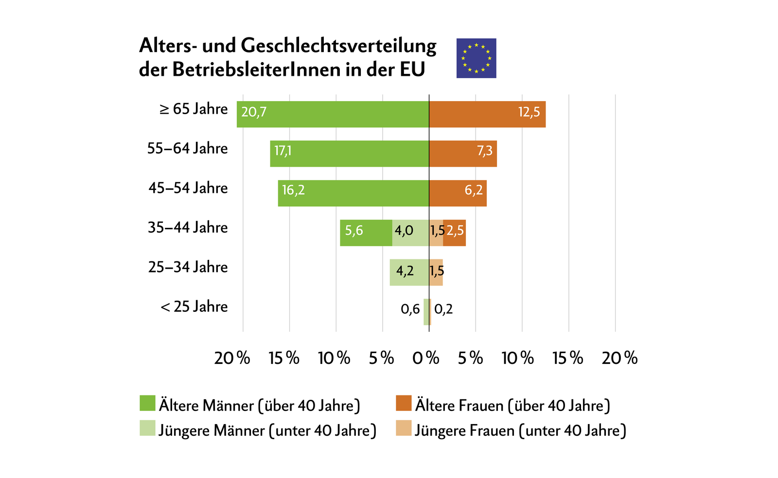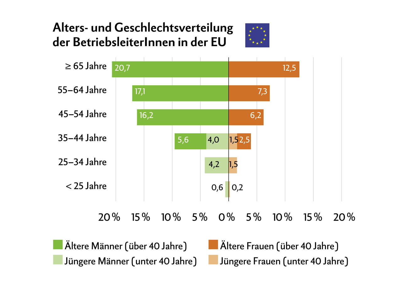 68 % der 9,1 Mio landwirtschaftlichen Betrieben in der EU wurden von Männern geleitet. 58 % aller BetriebsleiterInnen (also inkusive Frauen) waren mindestens 55 Jahre alt.