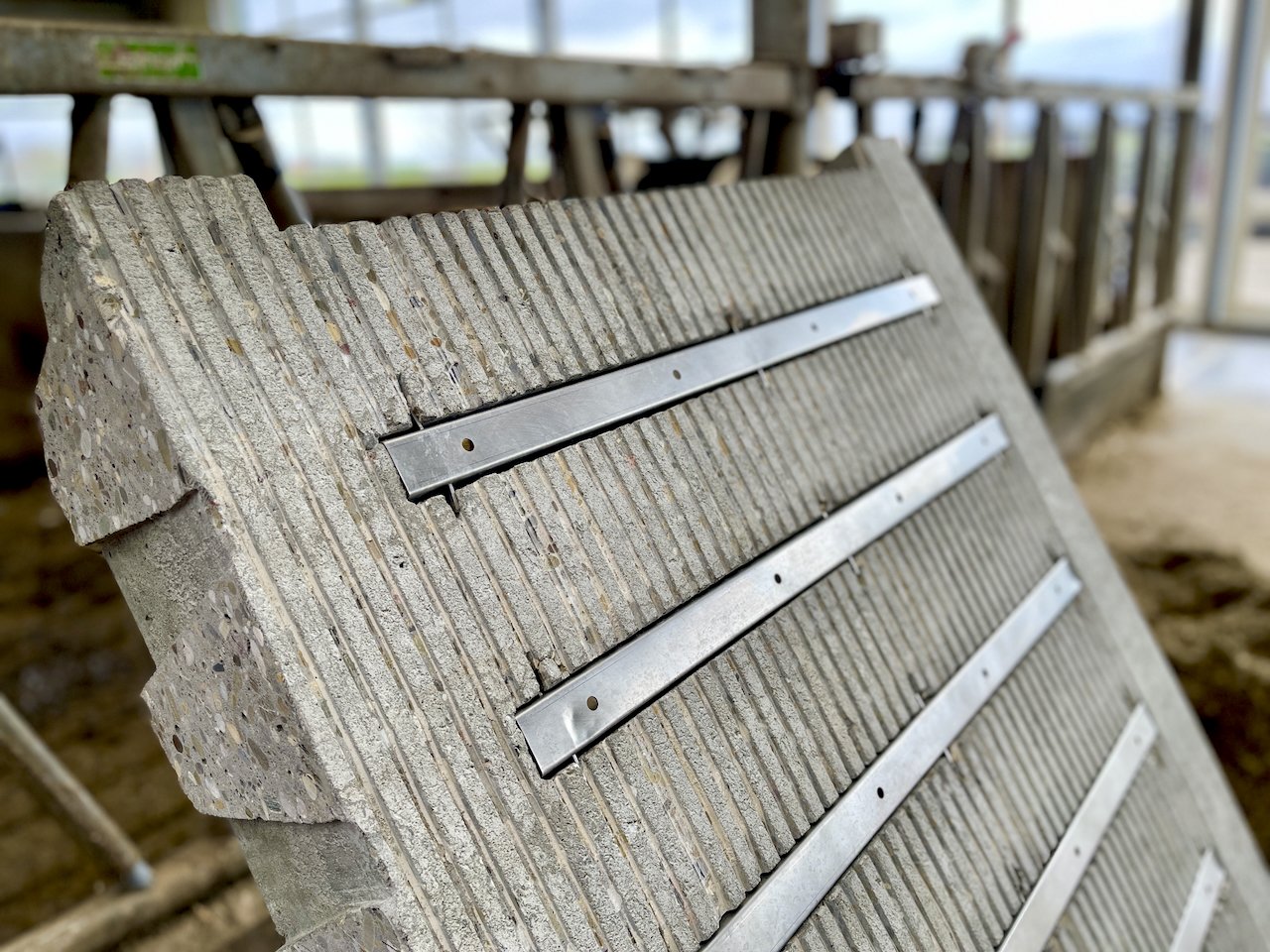 Slatted floors are retrofitted with stainless-steel separation strips. Urine trickles through the holes in the separation strips into the urine pit, while excrement remains on the floor surface.