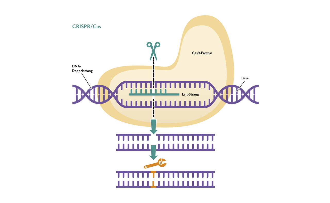 Bei CRISPR/Cas handelt es sich um das wohl bekannteste Verfahren zur modernen Genomveränderung (englisch = «genome editing»). Das Konzept dahinter ist folgendes: Es wird ein Leit-Strang, der das exakte Gegenstück zu einer bestimmten Stelle der DNA bildet, zusammen mit der Genschere in die Zelle gebracht. Der Leit-Strang macht sich auf die Suche nach dieser von Forschern vorbestimmten Stelle und dockt schliesslich am Ziel an. Nun kommt die eigentliche «Genschere» zum Zug, die durch den Leit-Strang an die richtige Stelle geführt wird: Das Cas9-Protein zerschneidet die DNA. Das setzt Reparatur-Mechanismen in Gang, die die Zelle für solche Fälle bereithält. Die meisten DNA-Brüche werden korrekt repariert. Ab und zu können aber auch Fehler passieren, wobei es zu Mutationen kommt.