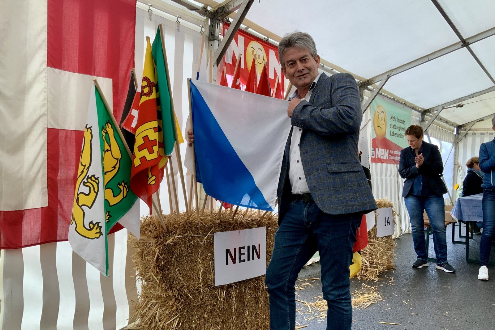 Als letzter Kanton liefert Zürich sein Resultat in der Abstimmung zur Massentierhaltungs-Initiative. Der Präsident des Zürcher Bauernverbandes, Martin Haab, steckt die Zürcher Fahne in die Strohballen mit den Nein-Kantonen.