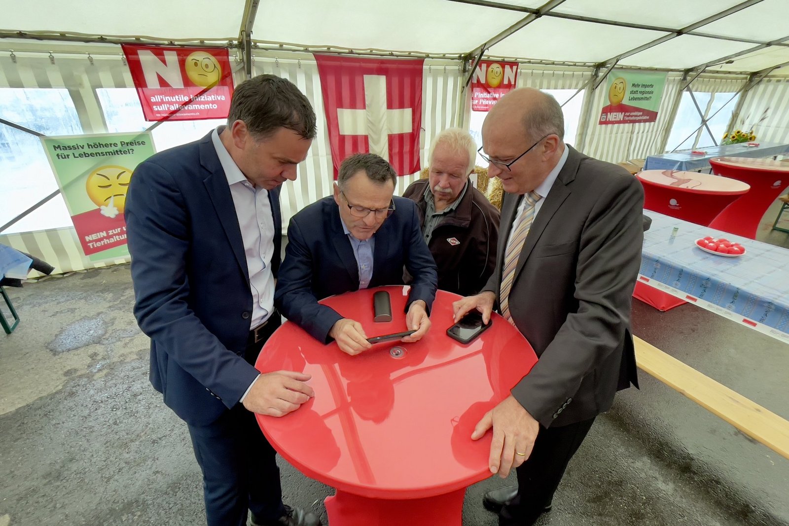 Im Lager der Gegner warten (v.l.) SBV-Direktor Martin Rufer, SBV-Kampagnenleiter Urs Schneider und SBV-Präsident Markus Ritter vom Schweizer Bauernverband gespannt auf die ersten Resultate zur Massentierhaltungs-Initiative.