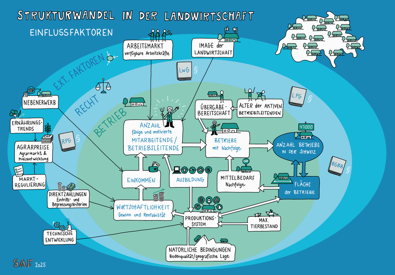 Beim Strukturwandel der Schweizer Landwirtschaft spielen die externen Faktoren eine grosse Rolle. «Denn sie sorgen für ein Umfeld, in dem gearbeitet werden kann oder muss», sagt Hansjürg Jäger. Politische und regulatorische Rahmenbedingungen (wie das Raumplanungsgesetz oder das Bundesgesetz über das bäuerliche Bodenrecht) gehören ganz klar dazu.