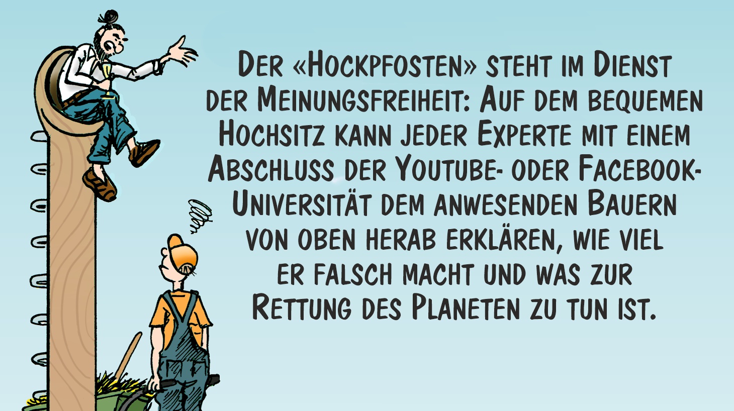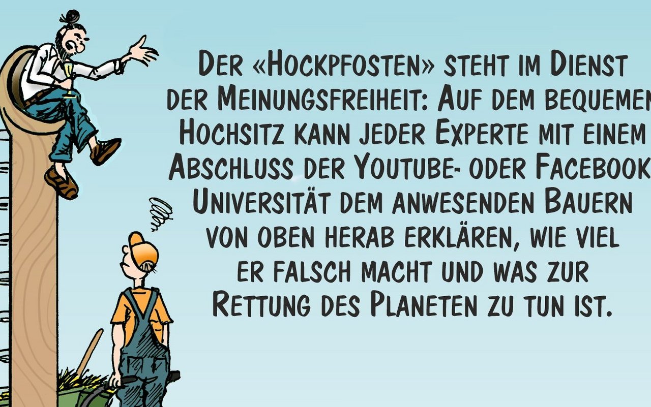 Auf dem «Hockpfosten» kann jeder erklären, wie er sich die Rettung der Welt vorstellt. (Bild: Cartoon: Marco Ratschiller/Karma)