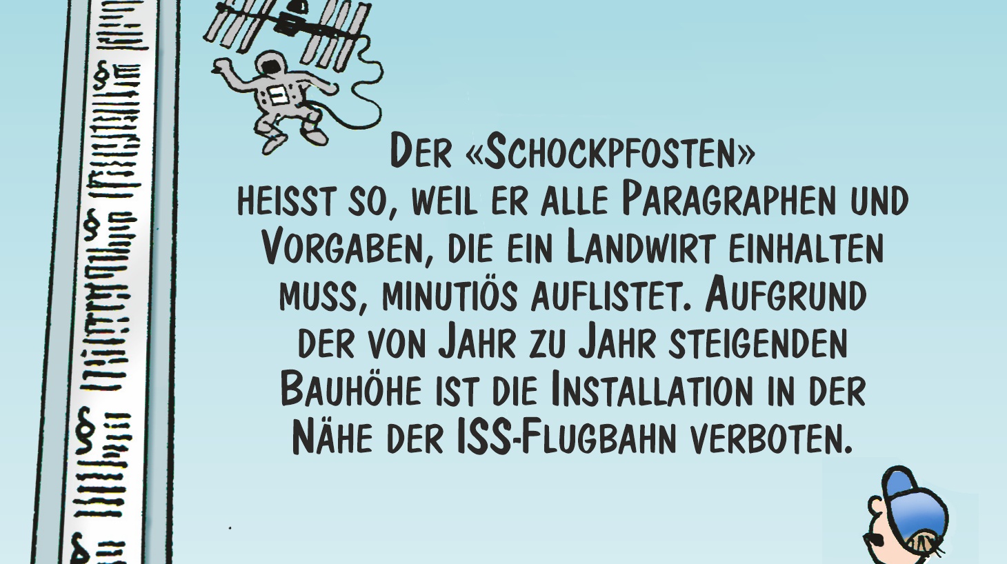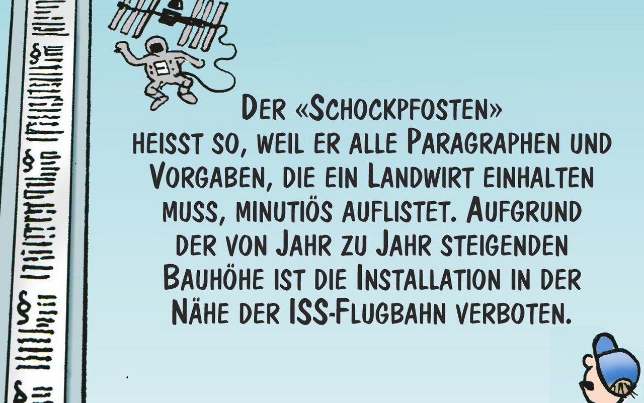 Der «Schockpfosten» listet alle Paragraphen und Vorgaben auf, an welche sich Landwirte halten müssen. (Bild: Cartoon: Marco Ratschiller/Karma)