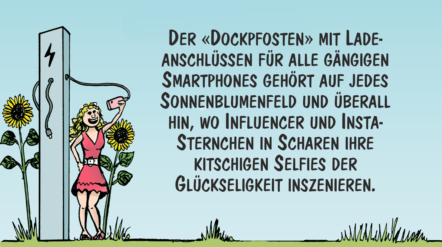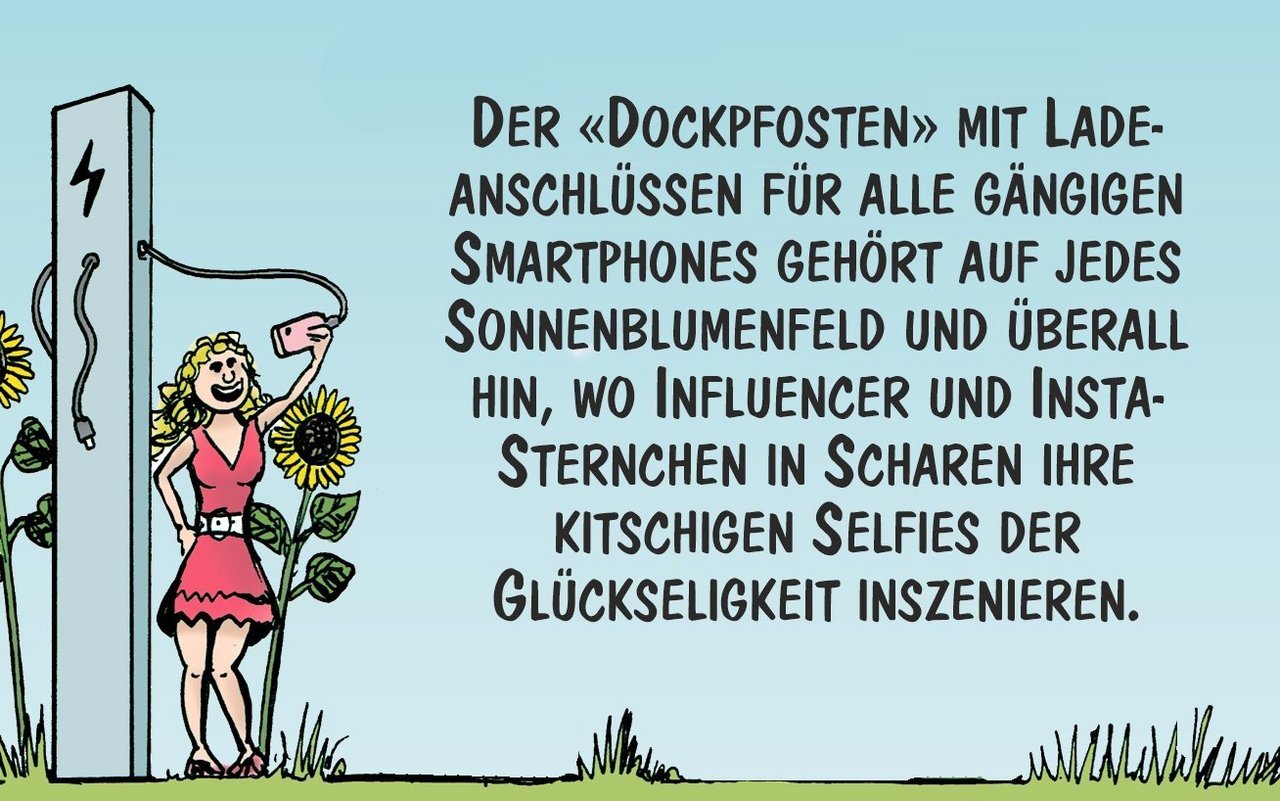 Dank dem «Dockpfosten» können Influencer ihre Bilder inszenieren und hochladen. (Bild: Cartoon: Marco Ratschiller/Karma)