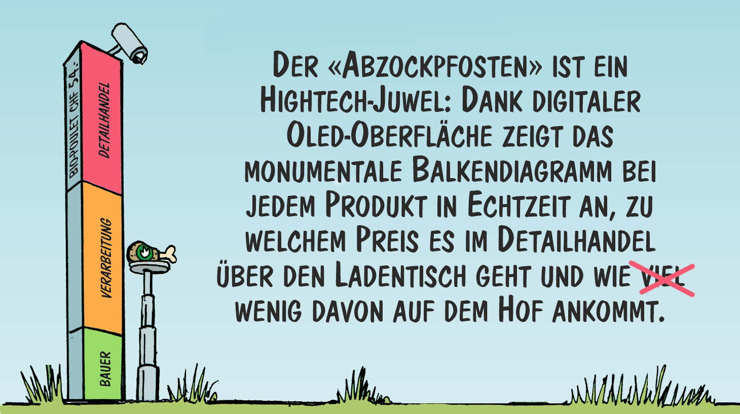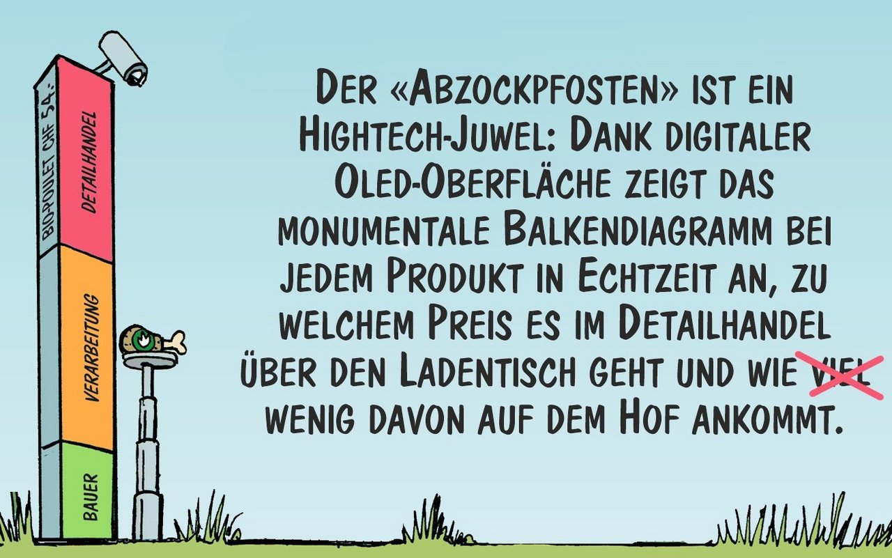 Dank dem «Abzockpfosten» sehen KonsumentInnen, zu welchem Preis das Produkt über den Ladentisch geht und wie viel (bzw. wie wenig) davon auf dem Hof ankommt. (Bild: Cartoon: Marco Ratschiller/Karma)