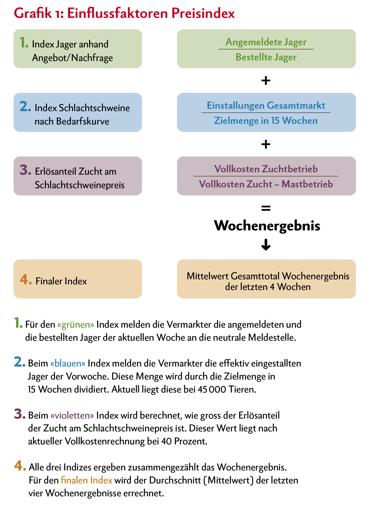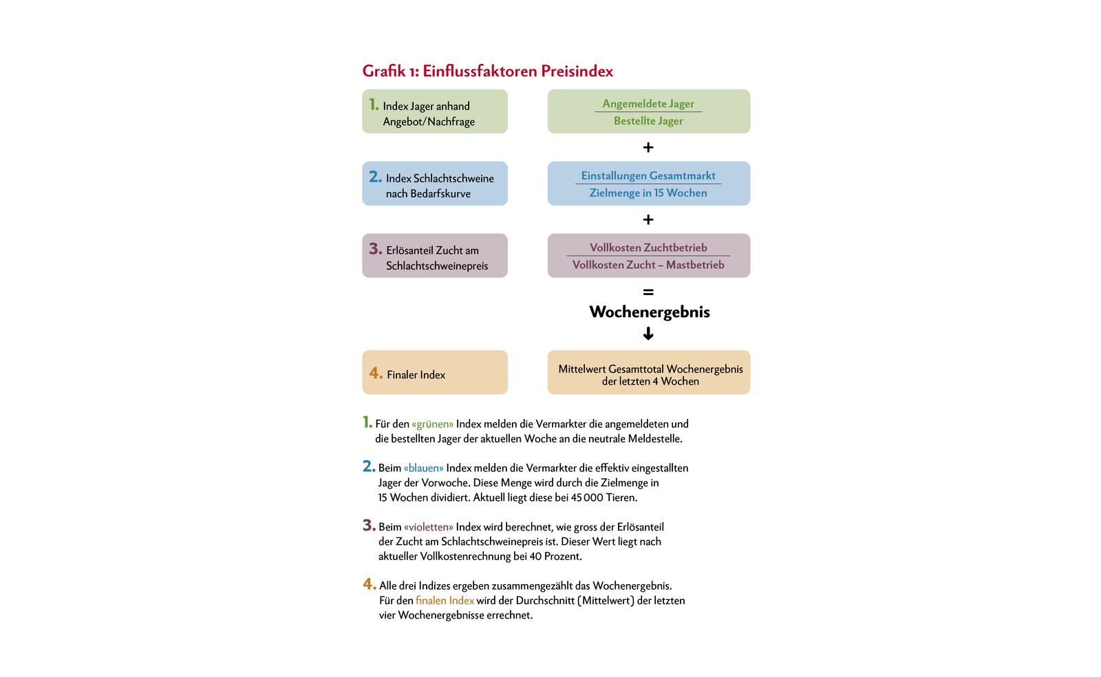 Neu wird der Jagerpreis also nicht mehr an dieser Börse zwischen Züchtern, Mästern und Händlern verhandelt. Stattdessen wird anhand messbarer Indikatoren ein Index berechnet (siehe Grafik 1). Dieser Index wird wiederum mit dem aktuellen Schlachtschweinepreis multipliziert (siehe Grafik 2).
