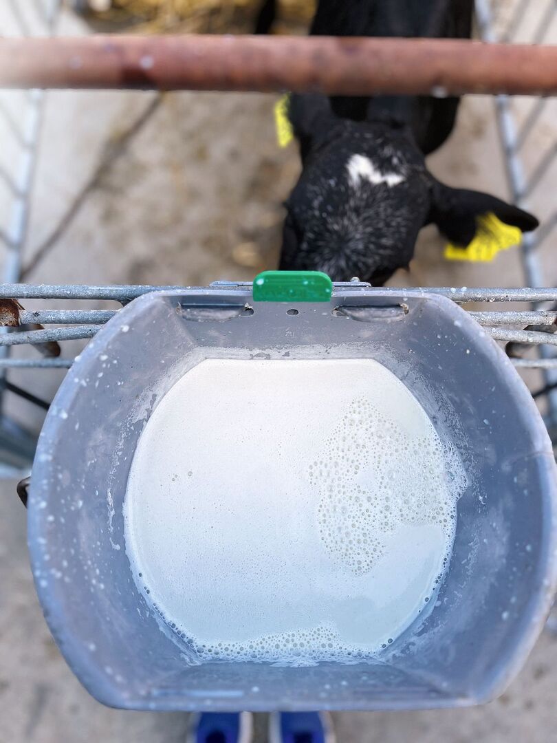 Pirmin Wandeler vertränkt keine Milch, sondern mischt Vollmilchpulver an, in einer Konzentration von 135 g/L Tränke. Ursprünglich entschied er sich dafür, weil er die Milch nicht ansäuern wollte. «Ich wollte keine Chemie beimischen. Auch wenn das bei anderen eine gute Option ist: Für mich persönlich stimmt das so nicht.» Vom Milchpulver versprach er sich, dass sich die Milch im Eimer länger halten würde. Die Überlegung scheint aufzugehen: Die Milch im Eimer wird nicht schlecht – auch ohne Ansäuerung.
