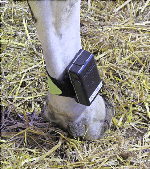 Ein Pedometer wird am Bein der Kuh befestigt. Durch die Erfassung der Schrittzahl wird die Bewegungsaktivität gemessen. Erweiterte Systeme können auch Parameter wie Steh- und Liegezeiten und die Anzahl Aufsteh-Ereignisse erfassen.