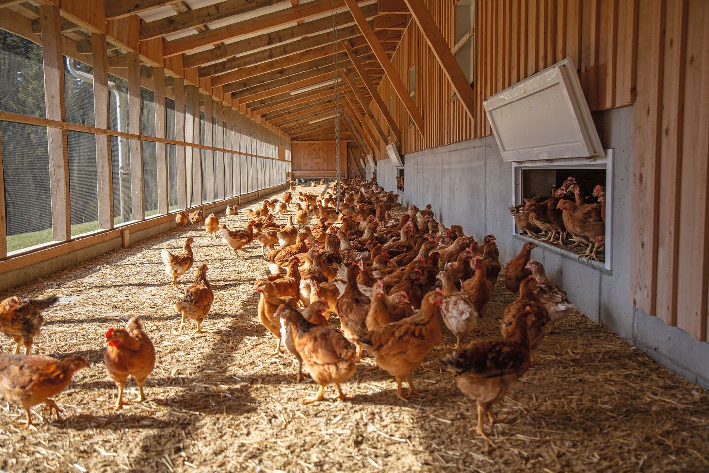 Kein einziges Huhn traut sich an diesem Nachmittag nach draussen auf die Weide. Lieber sonnen sich die Tiere im Aussenklimabereich, in dem die Sonne den Stallboden aufwärmt. Oder sie bleiben gleich im Stall, bei angenehmen 22 Grad.[IMG 2]