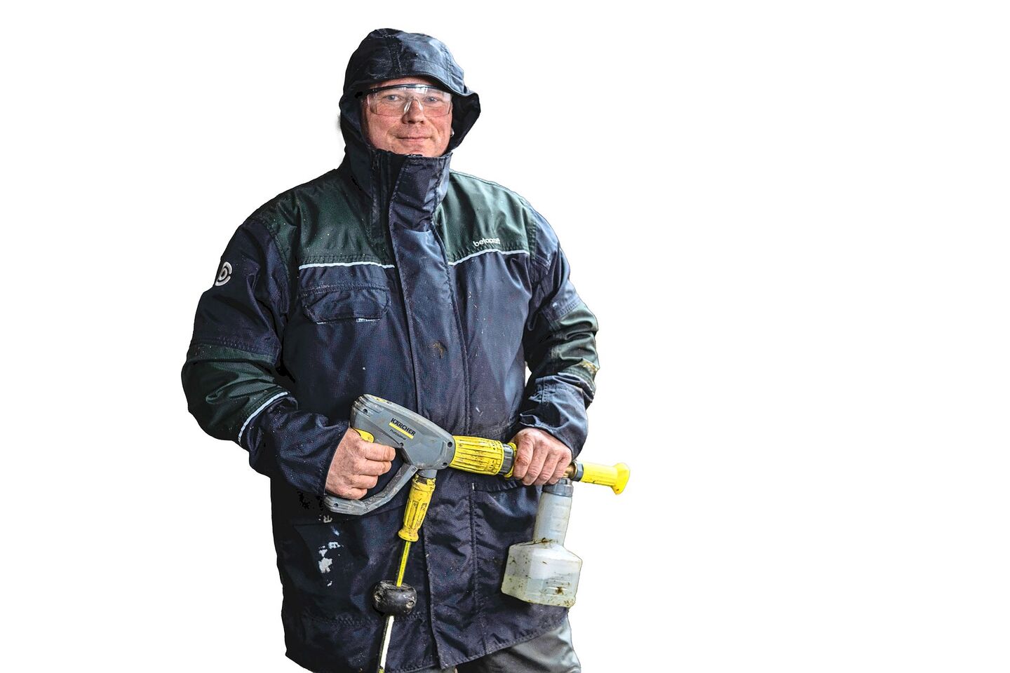 Danach befeuchtet Abderhalden mit kaltem Wasser und der Flachstrahldüse des elektrisch betriebenen Kärcher-Hochdruckreinigers alles, was er intensiv reinigen will. Dann hat die Schaumlanze mit dem Reinigungsmittel aus der Kärcher-Natural-Linie ihren Auftritt: Schaum haftet gut an Oberflächen und kann so besser einwirken. [IMG 6]
