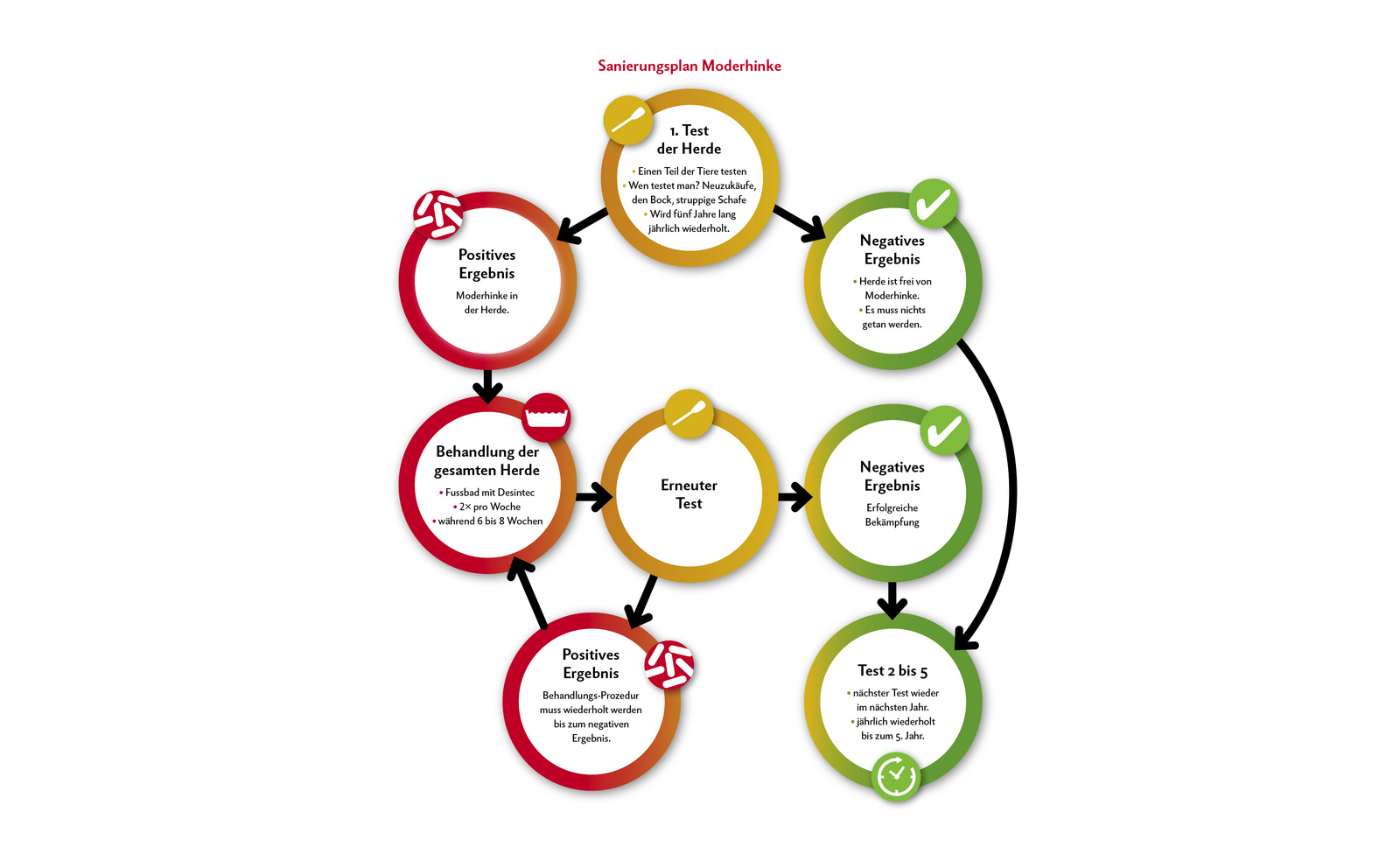 Das nationale Projekt dauert fünf Jahre. In dieser Zeit werden die Tiere aller Schafhalter jährlich getestet – auch wenn sie im vorherigen Jahr keine Moderhinke in der Herde hatten. Wird Moderhinke festgestellt, muss die ganze Herde behandelt werden. Allenfalls muss dies mehrmals durchgeführt werden – solange, bis ein negatives Testergebnis vorliegt.