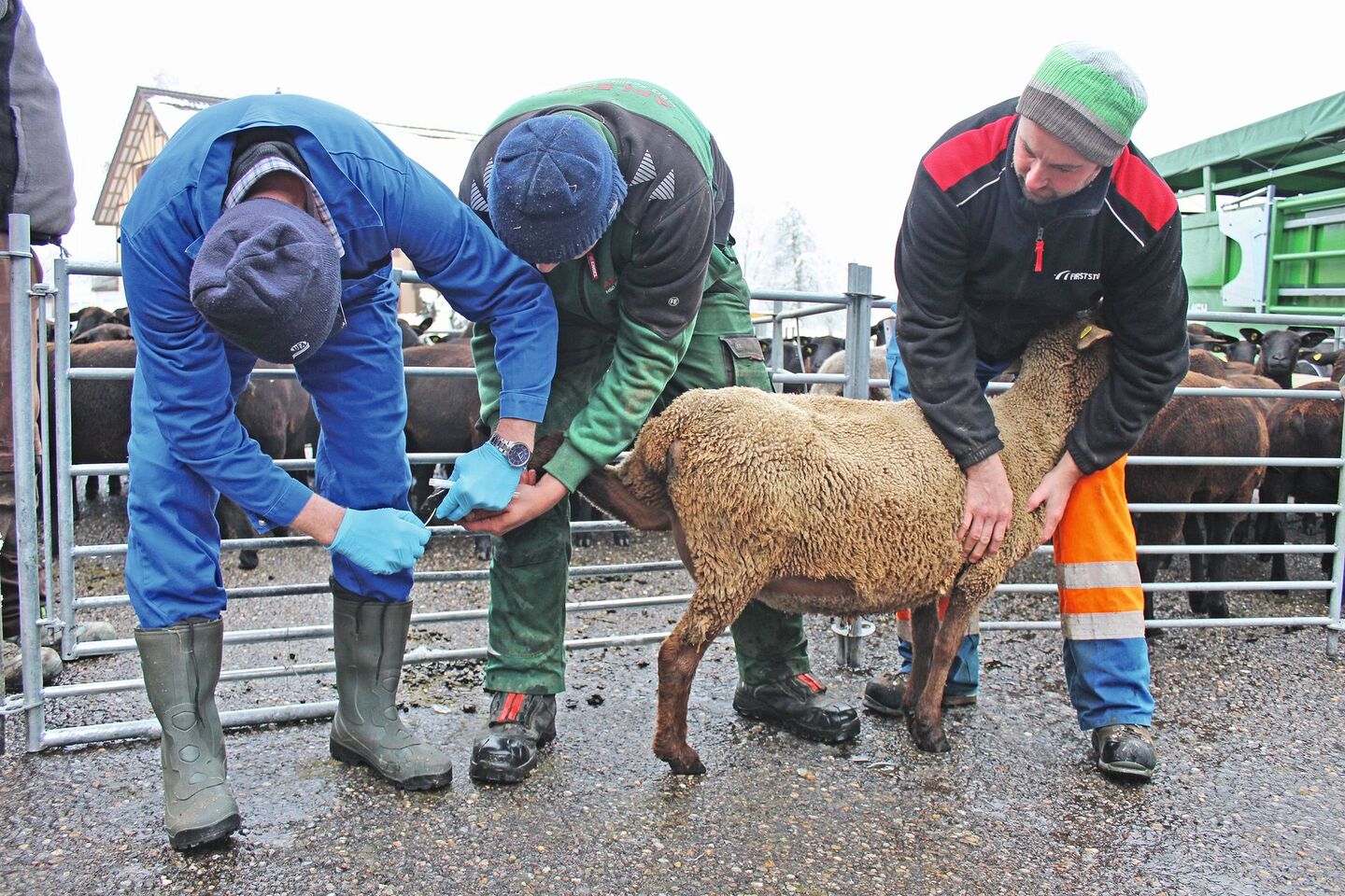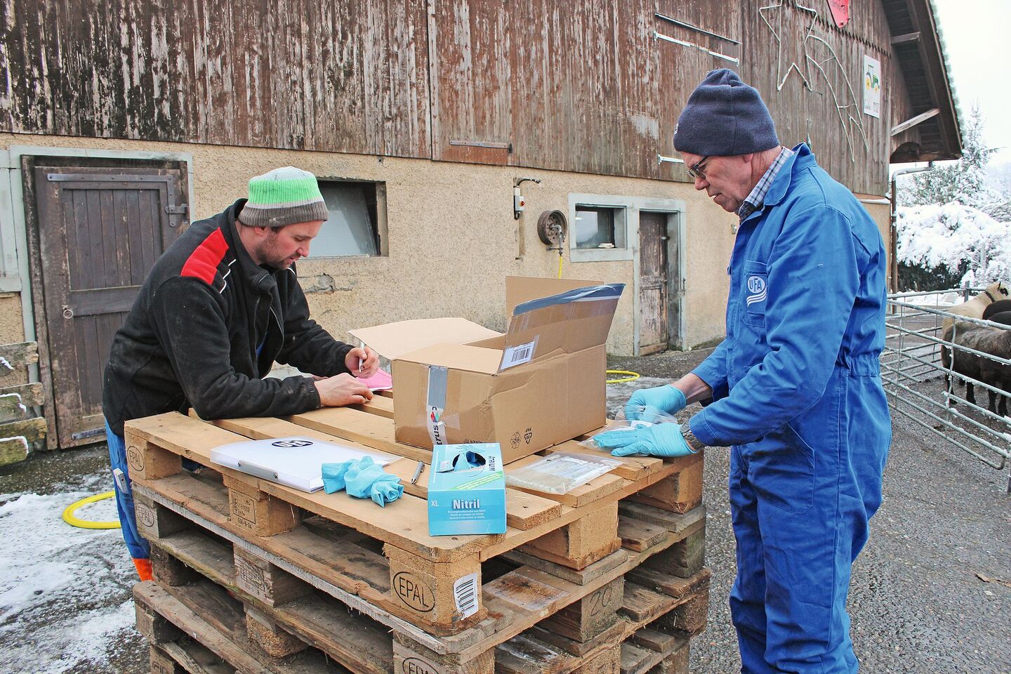 Bei Roger Stöckli sind es 28 Tiere aus seinen drei Gruppen, die getestet werden. Die Auswahl ist nicht zufällig: «Der Bock, Neuzukäufe, solche die sich gerne verstecken oder struppig wirken, sind gute Kandidaten. Ausserdem frage ich den Landwirt, ob er hinkende Tiere hat», sagt Probennehmer Baumgartner. Die Proben werden dann in ein Labor geschickt.